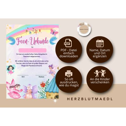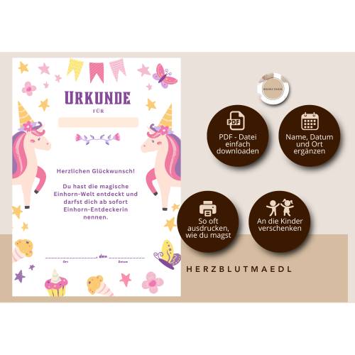 Für eine persönliche Note bieten wir dir die Möglichkeit, deine eigene Botschaft oder Widmung auf der Urkunde zu verewigen. Gegen einen geringen Aufpreis von nur 5 Euro kannst du deinen individuellen Text hinzufügen lassen, sei es eine herzliche Glückwunschnachricht, ein inspirierendes Zitat oder ein spezielles Datum. Dieses Angebot ist exklusiv in unserem Shop verfügbar, um sicherzustellen, dass dein Mitgebsel noch persönlicher wird. Lege einfach meinen Artikel "Urkunde mit Wunschtext" zusätzlich in deinen Warenkorb und hinterlasse uns deine gewünschte Nachricht. Wir kümmern uns dann um den Rest, damit der Kindergeburtstag für immer unvergesslich bleibt.