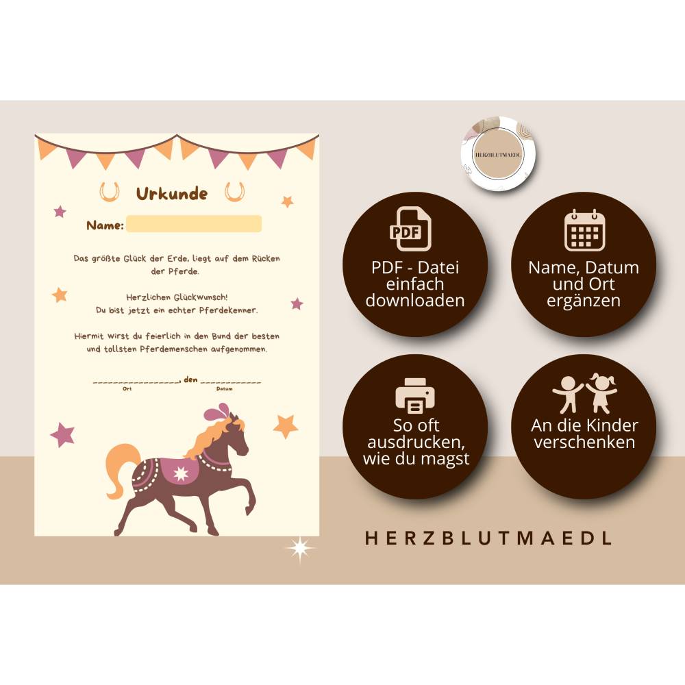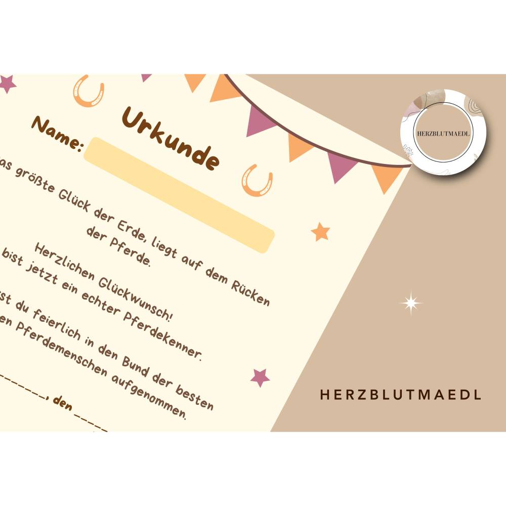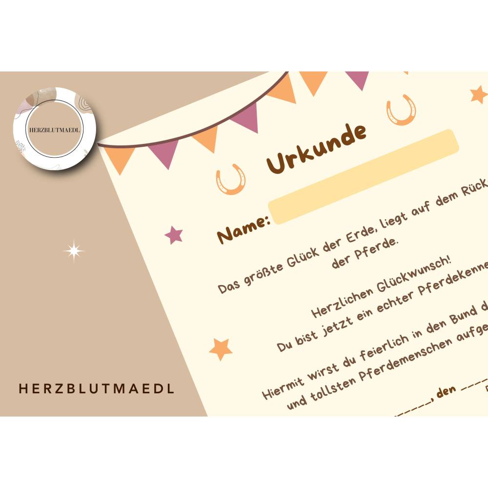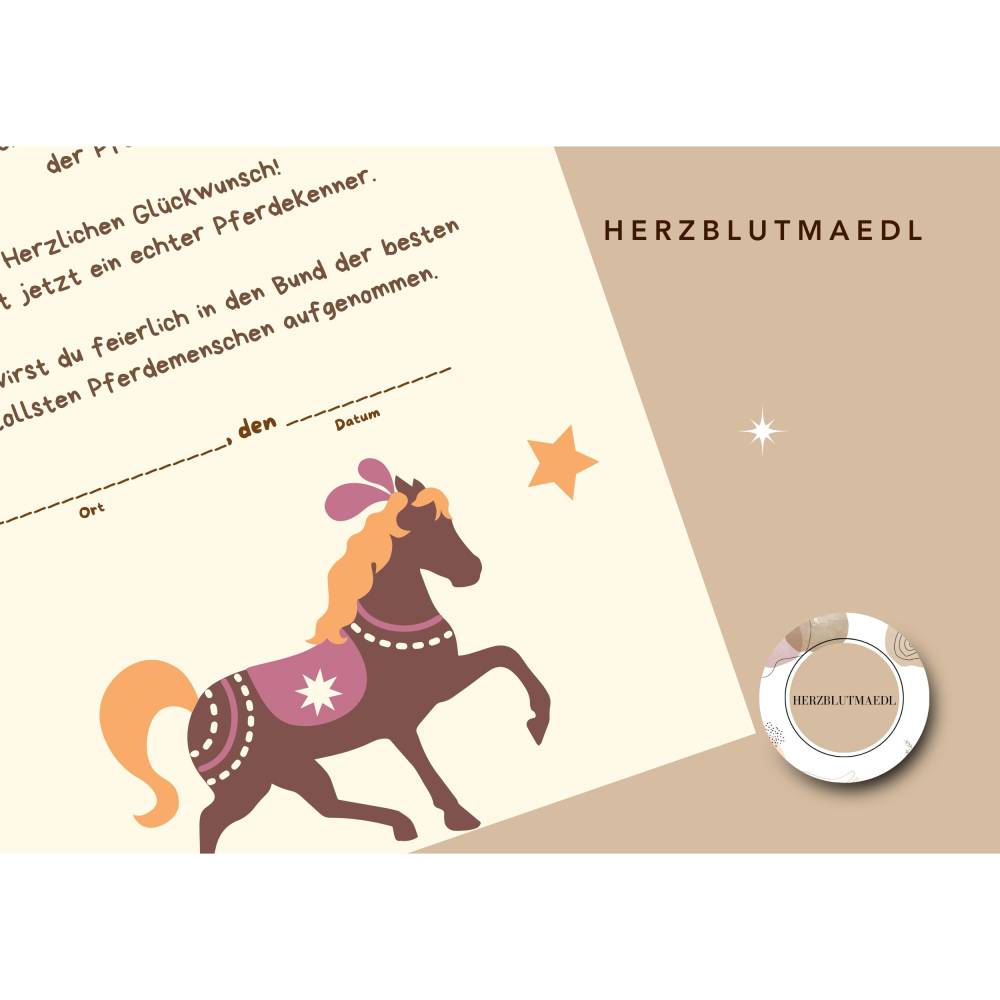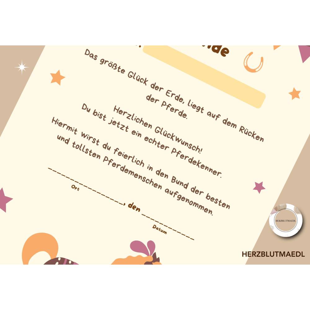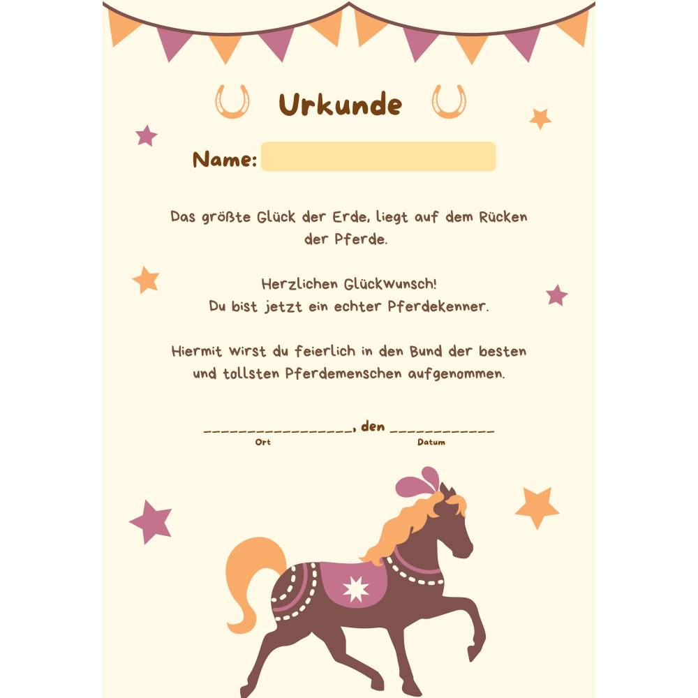 Reiterhof / Pferde Urkunde – Personalisierte A4 Mitgebsel für Kindergeburtstag & Reiterhof-Party