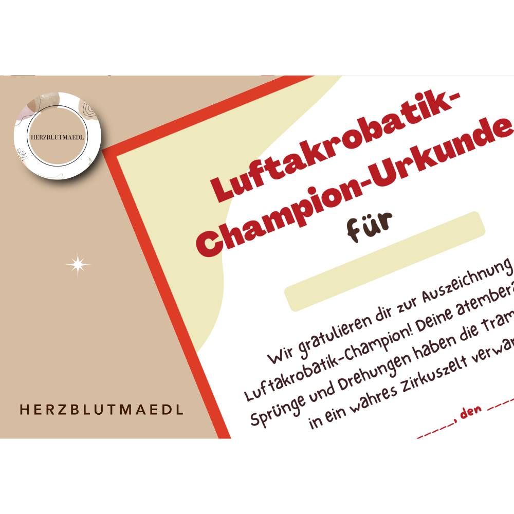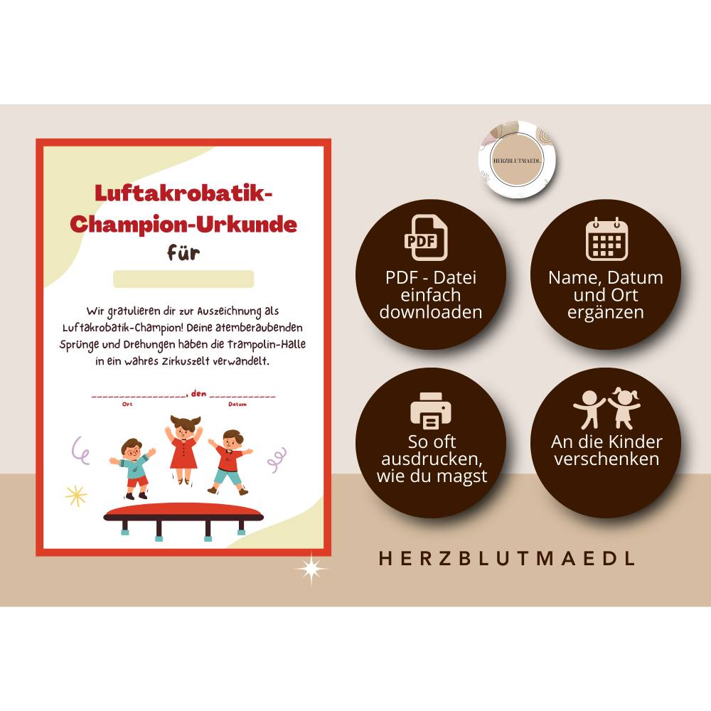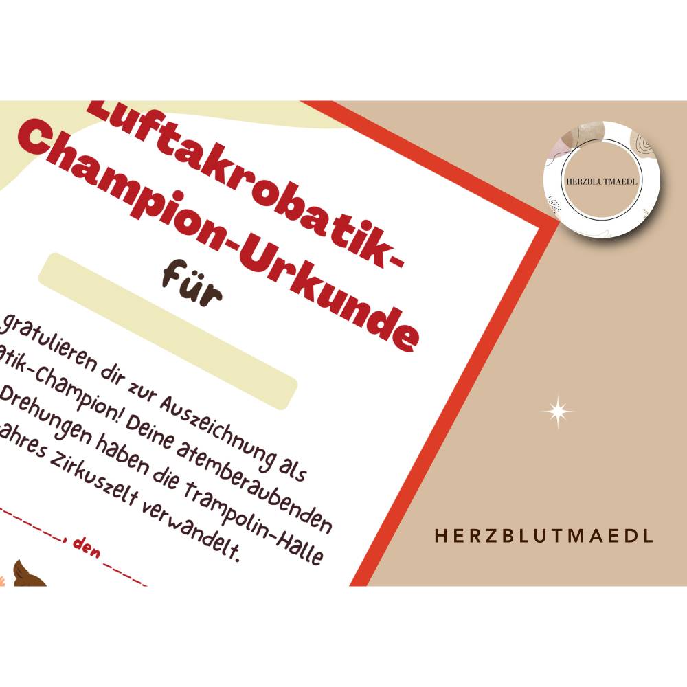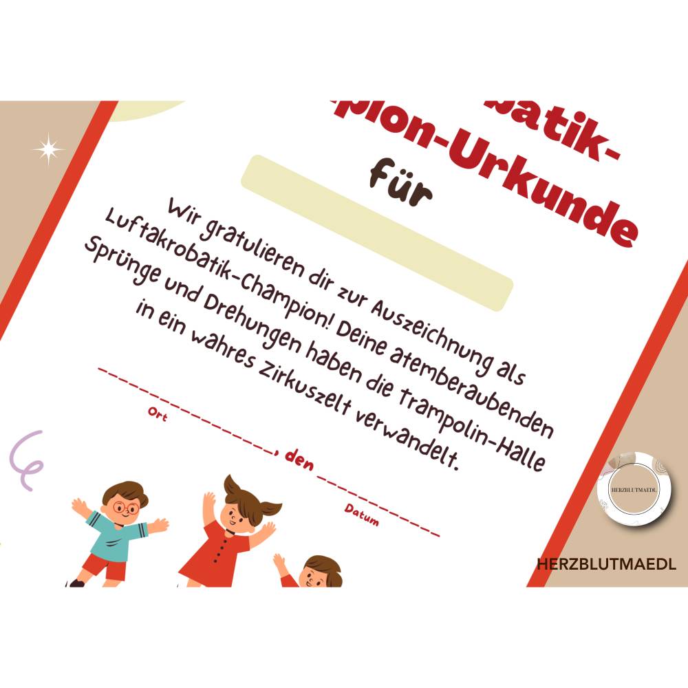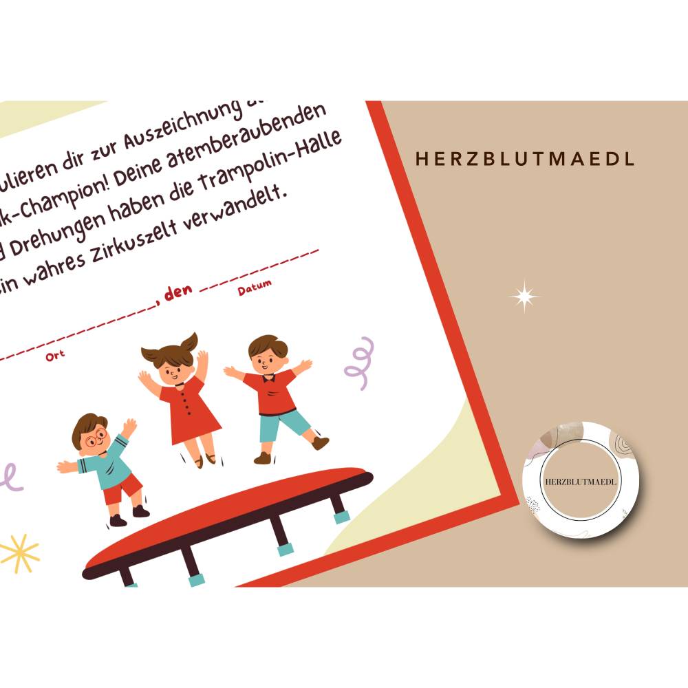 Mach den Geburtstag deines Kindes zu einem unvergesslichen Erlebnis mit unserer einzigartigen, personalisierten Trampolin-Urkunde! Diese liebevoll gestaltete A4-Urkunde ist das perfekte Mitgebsel, um kleine Gäste zu begeistern und für strahlende Kinderaugen zu sorgen. Jede Urkunde wird individuell mit dem Namen des Geburtstagskindes und dem Datum des Events gestaltet – einfach herunterladen, ausdrucken, beschriften und verschenken. Ideal für Kindergeburtstage, Trampolin-Partys, Wettkämpfe oder als Spaßpreis bei Spielen. Mit dieser personalisierten Urkunde bringst du Freude, Stolz und schöne Erinnerungen in die Herzen der kleinen Gäste.