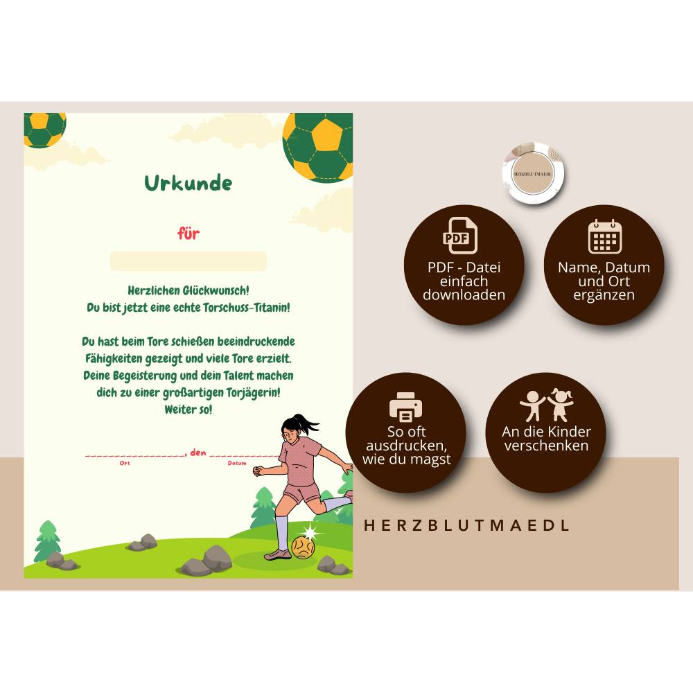 Du erwirbst in diesem Angebot die Urkunde "Fußball". Die Urkunde ist perfekt für den Kindergeburtstag mit dem Motto Fußballturnier  oder andere Fußballveranstaltungen. Nach deiner Bestellung steht dir die Urkunde als PDF-Datei im Format DIN A4 sofort zur Verfügung. Du kannst sie so oft ausdrucken, wie du möchtest und als Mitgebsel in die Gasttüten packen. Die Urkunden werden von dir noch mit den Namen der Gastkinder, Ort und Datum versehen. Damit hat jeder Gast eine unvergessliche Erinnerung an einen einzigartigen Tag.