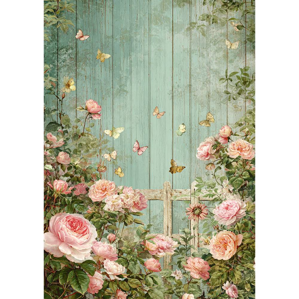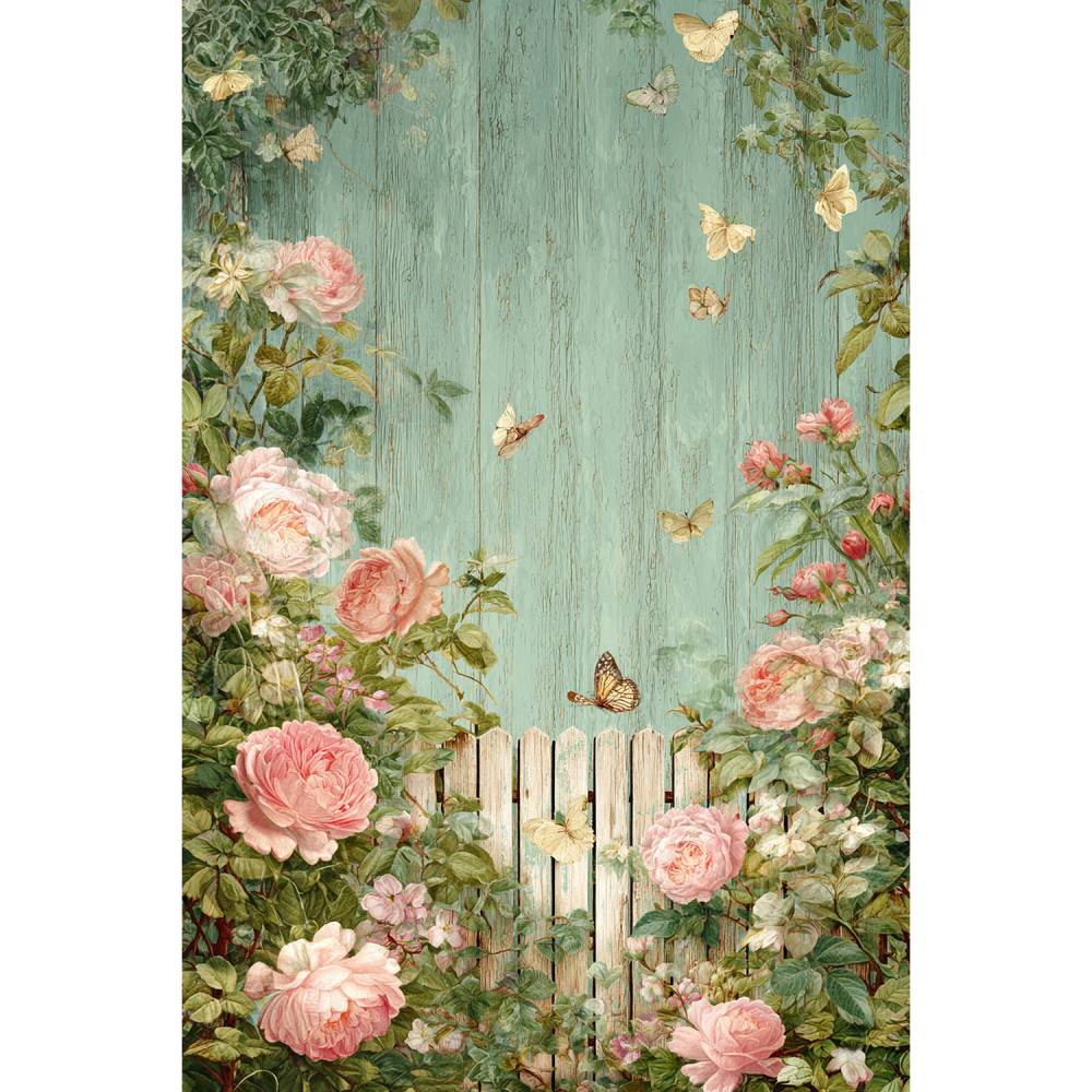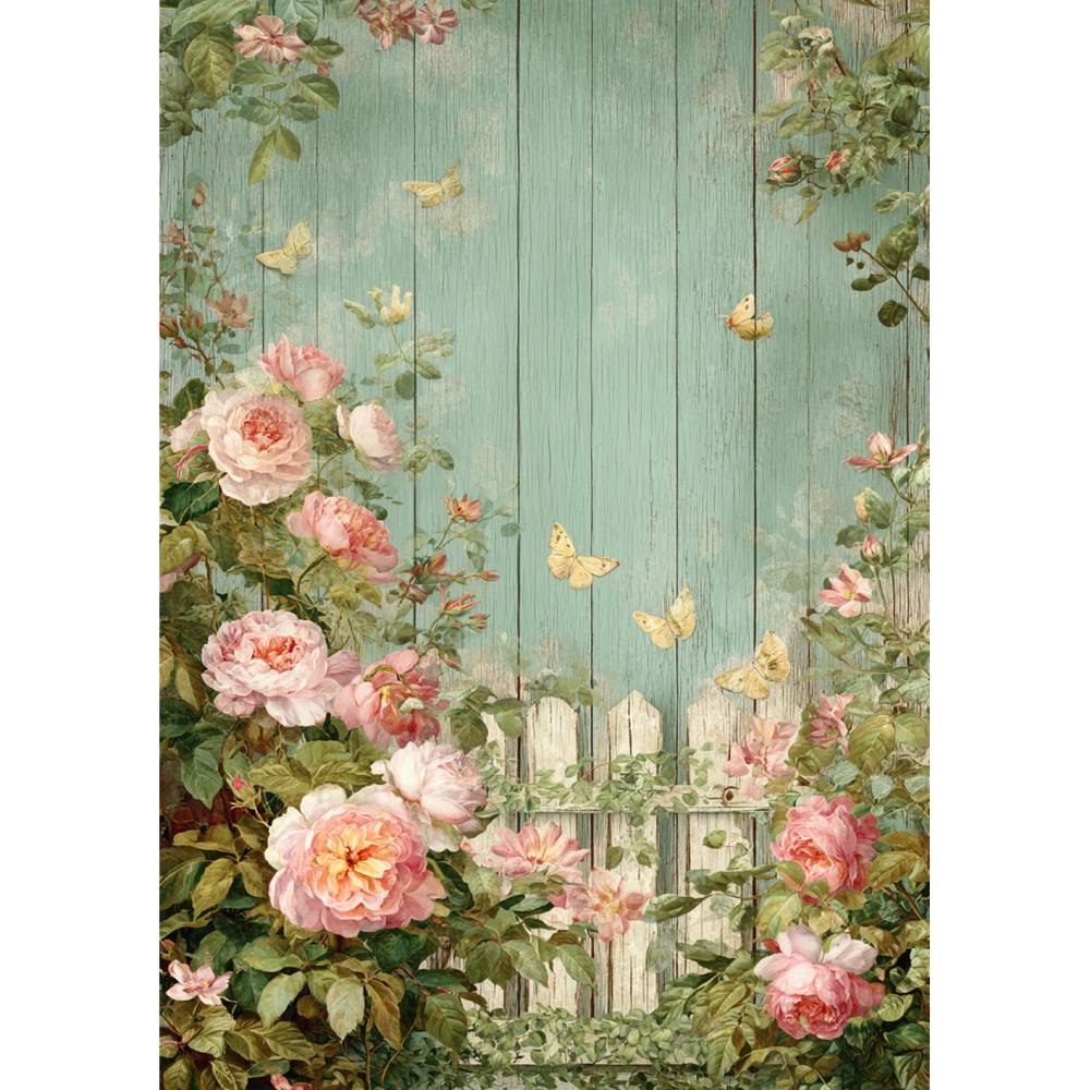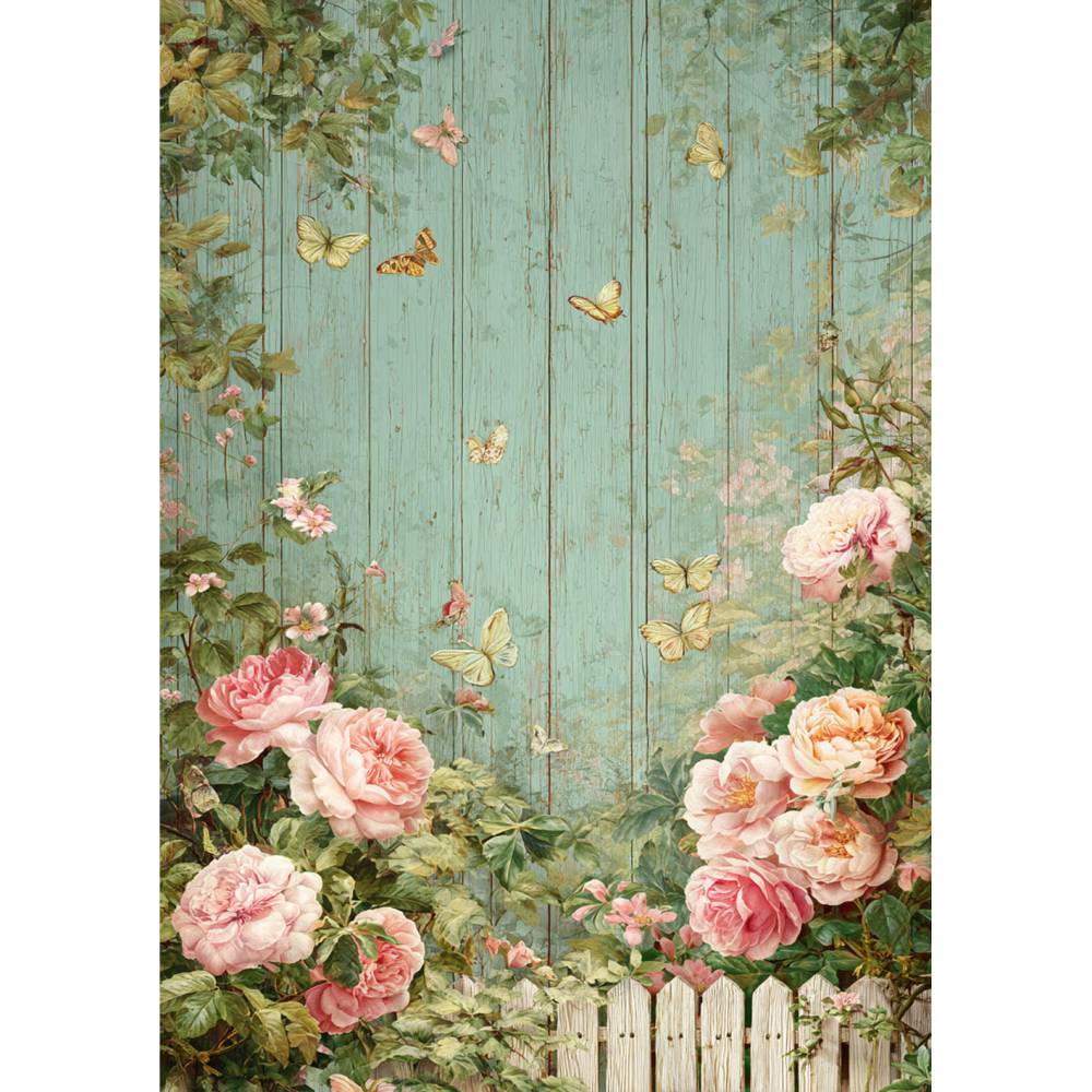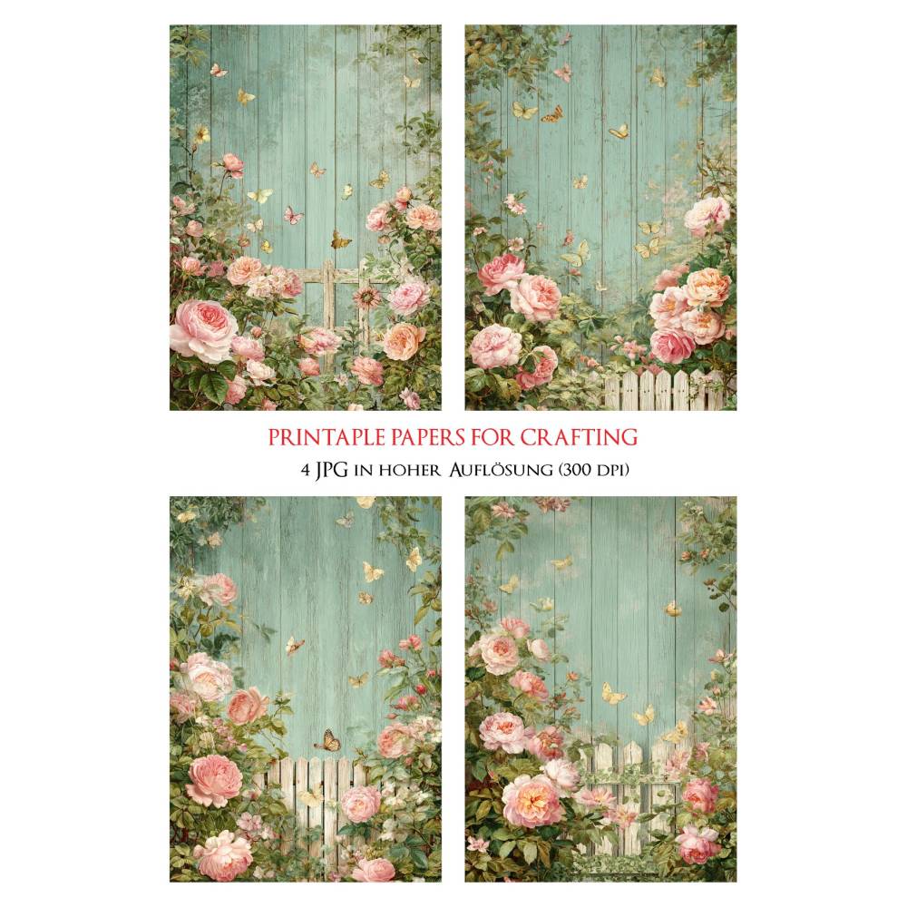 Die romantischen Rosenmotive mit Schmetterlingen auf einer verwitterten Holzoptik im Hintergrund sind perfekt für Druck, Scrapbooking, Einladungen, Wanddekorationen uvm.