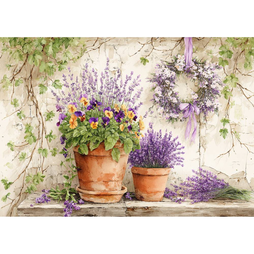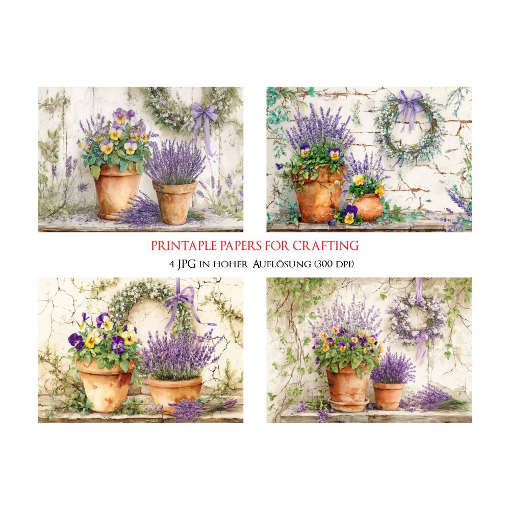 Wunderschönes Set aus 4 hochauflösenden JPG-Dateien (300 dpi) mit liebevoll gestalteten Blumenmotiven. Die romantischen Illustrationen zeigen Lavendel und bunte Stiefmütterchen in Terrakotta-Töpfen, verziert mit floralen Kränzen und dezenten Vintage-Elementen. Ideal für Drucke, Grußkarten, Wanddekoration oder kreative DIY-Projekte.