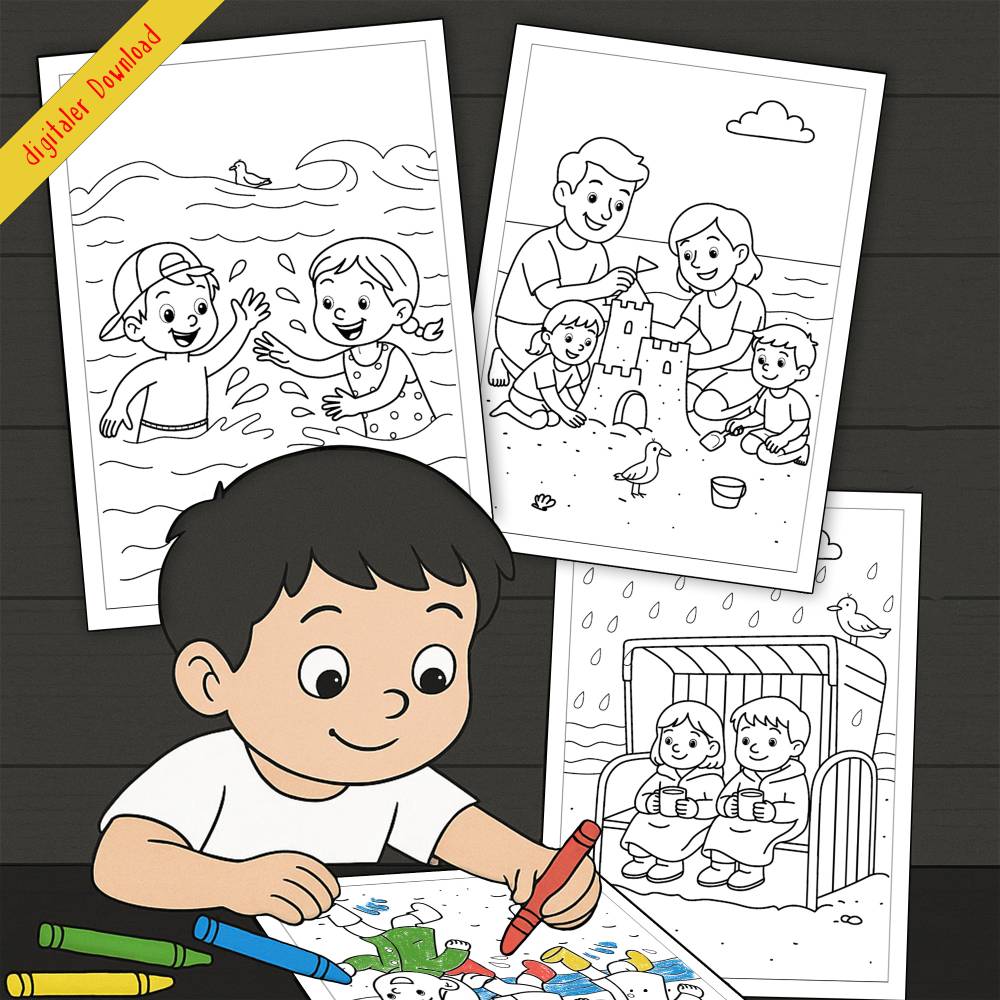 Dieses liebevoll gestaltete E-Book „Ferien am Meer“ ist die perfekte Beschäftigung für Kinder ab 4 Jahren - egal ob zu Hause, unterwegs oder am Urlaubsort! Auf 52 abwechslungsreichen Ausmalbildern erwarten die Kleinen fröhliche Szenen vom Strand, mit Sonne, Sand und auch ein paar Regentropfen.