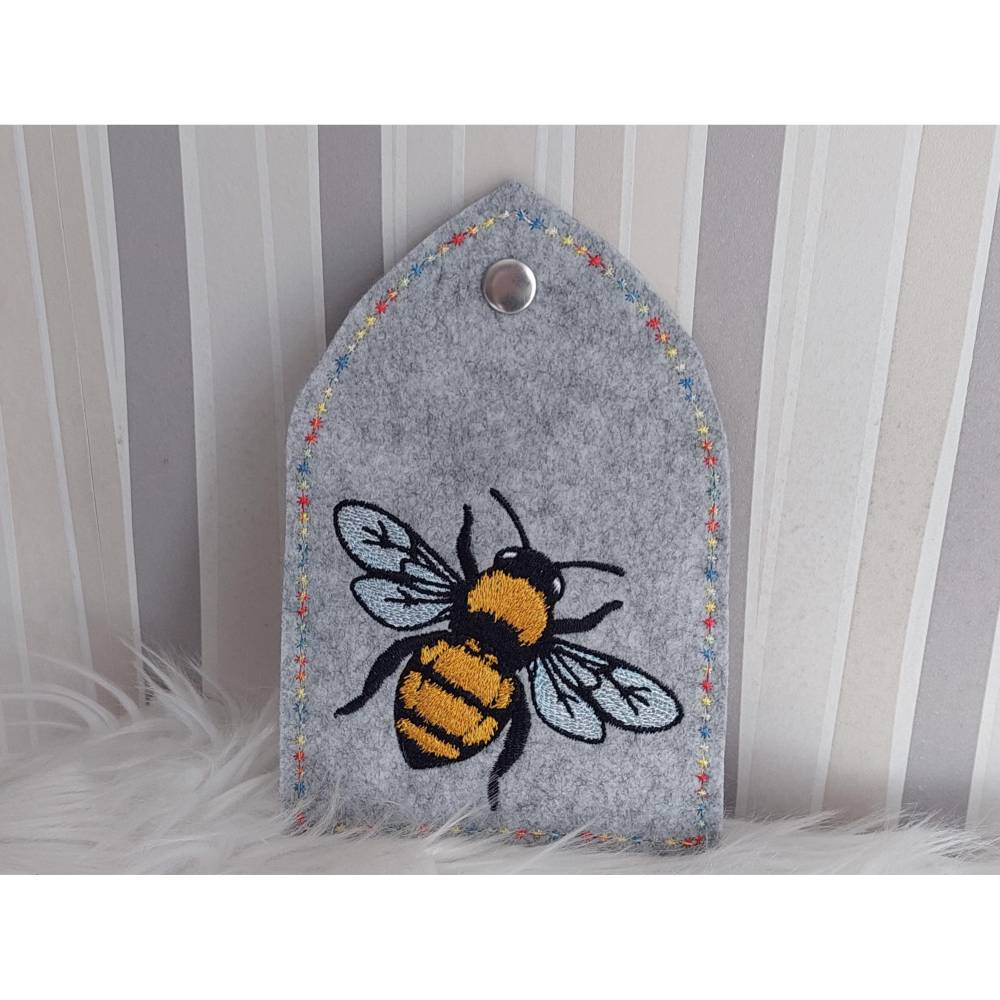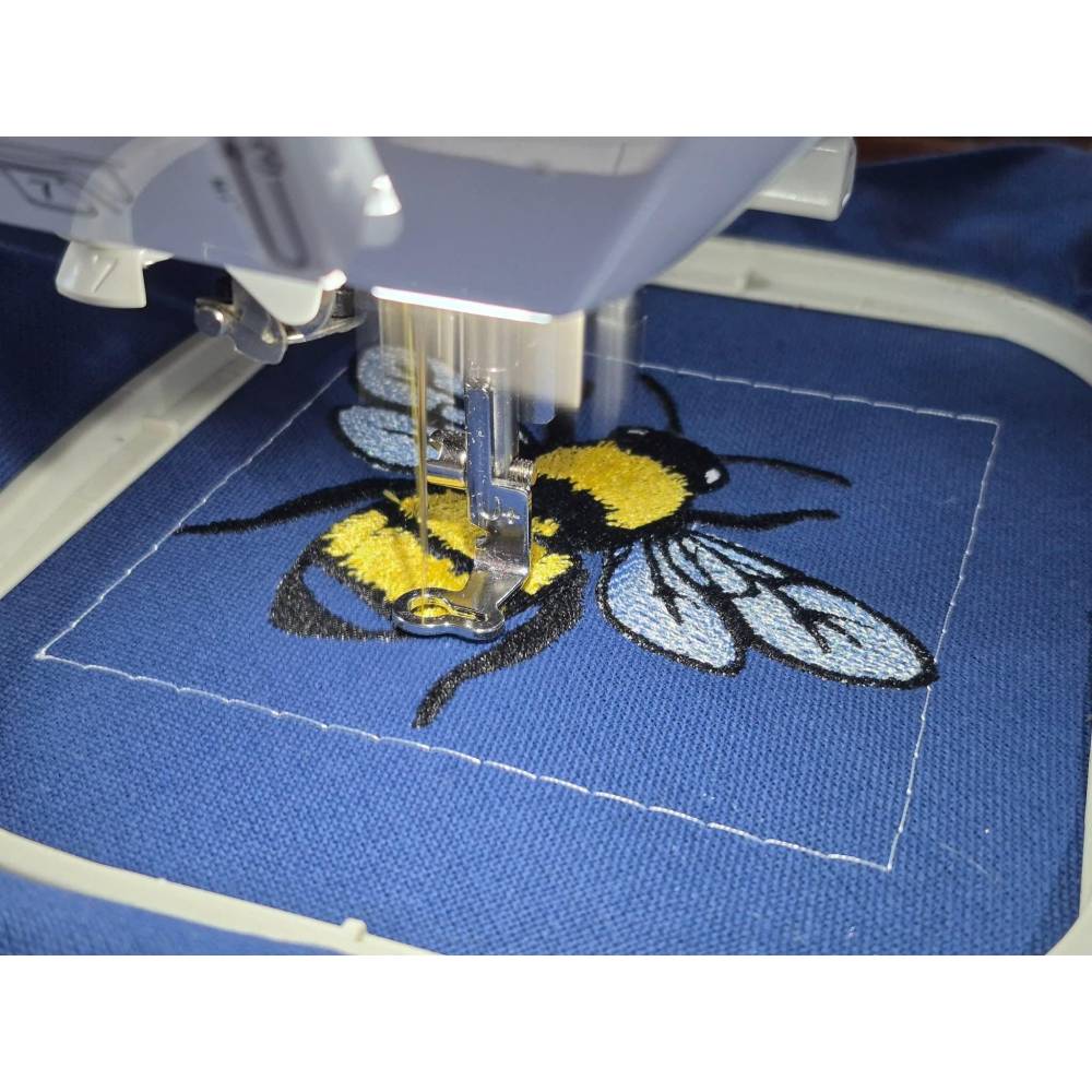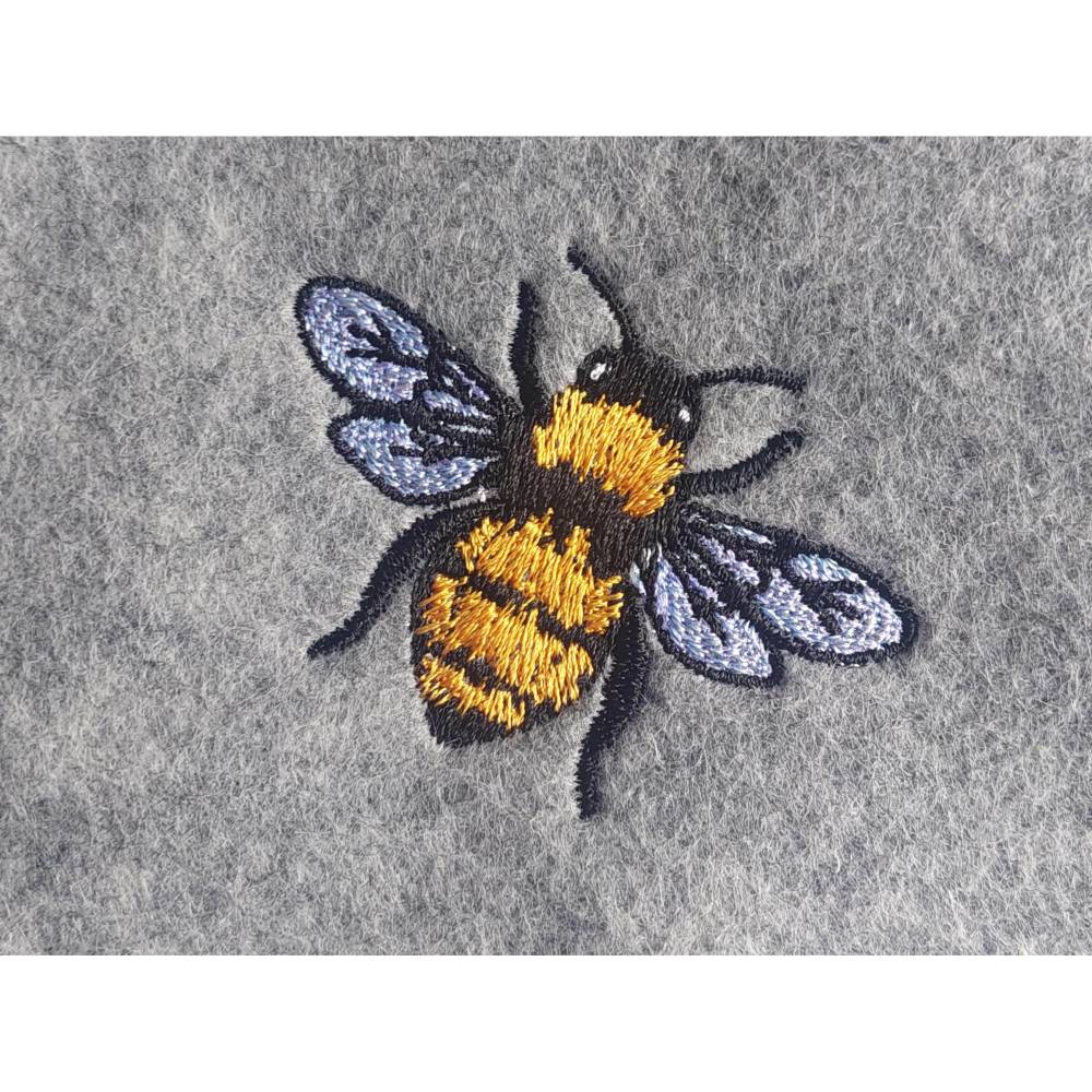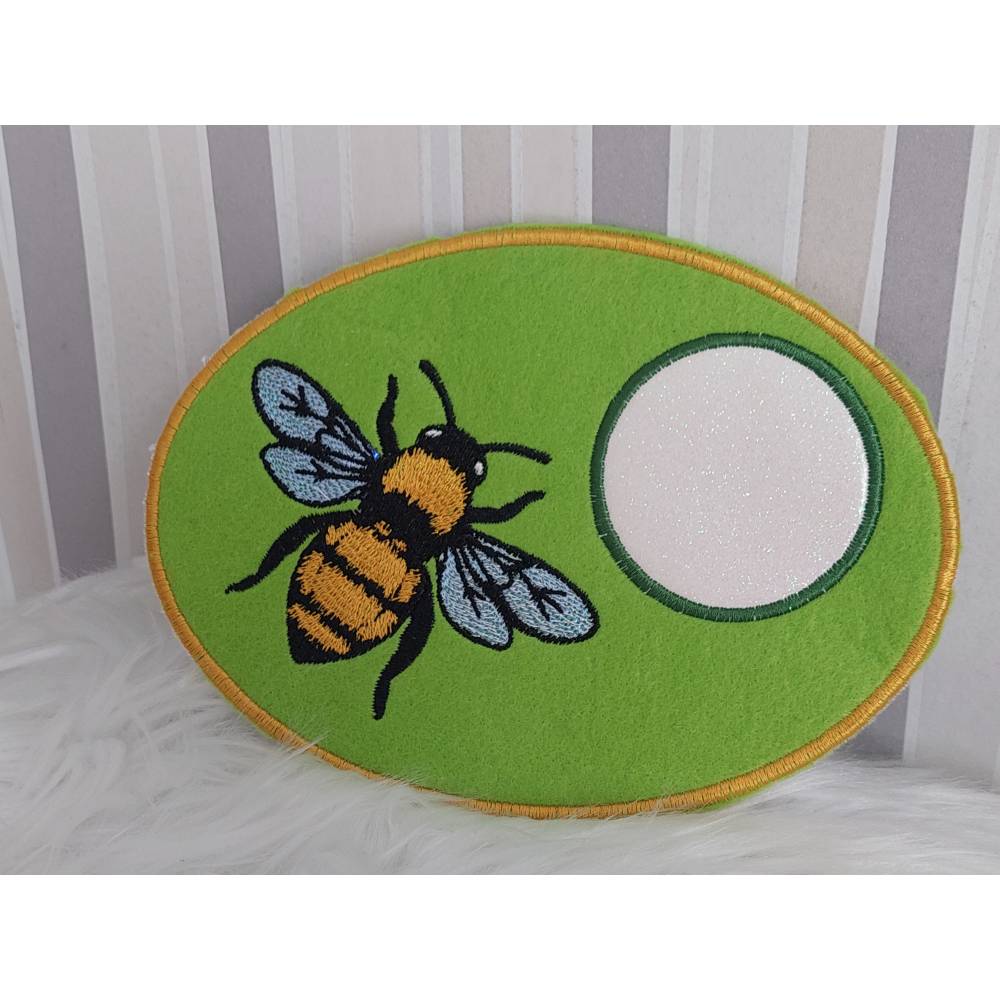 Die kleine Biene wurde sehr natürlich dargestellt. Die Flügel sind sehr filigran in zwei Farben gearbeitet und können optional mit Stickfolie unterlegt werden, damit sie glänzen. Aber die Unterlage aus weiß und das Relief in hellblau wirken schon lebensecht. Auch der Körper der Biene wurde detailreich dargestellt, das gelb/orange des Körpers wirkt durch leicht unregelmäßige Stiche etwas flauschig. Der restliche schwarze Körper ist wohlkonturiert und teils in Satin gelegt.