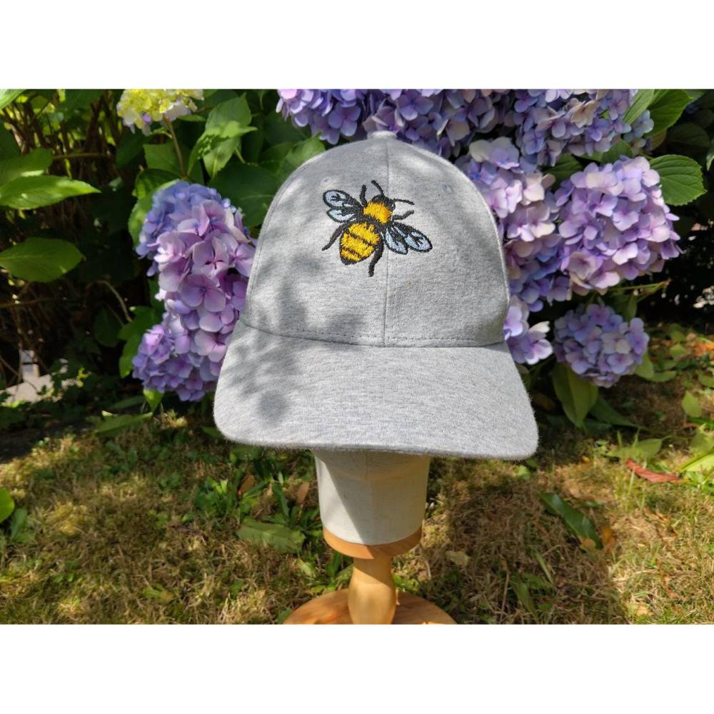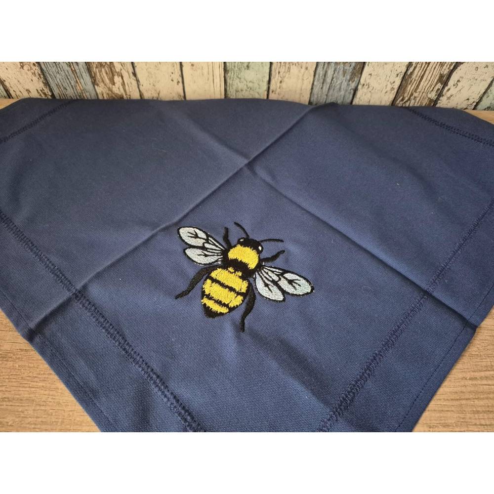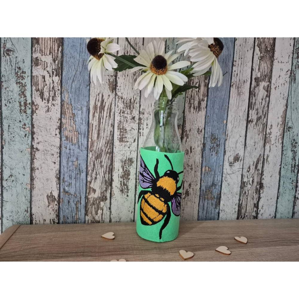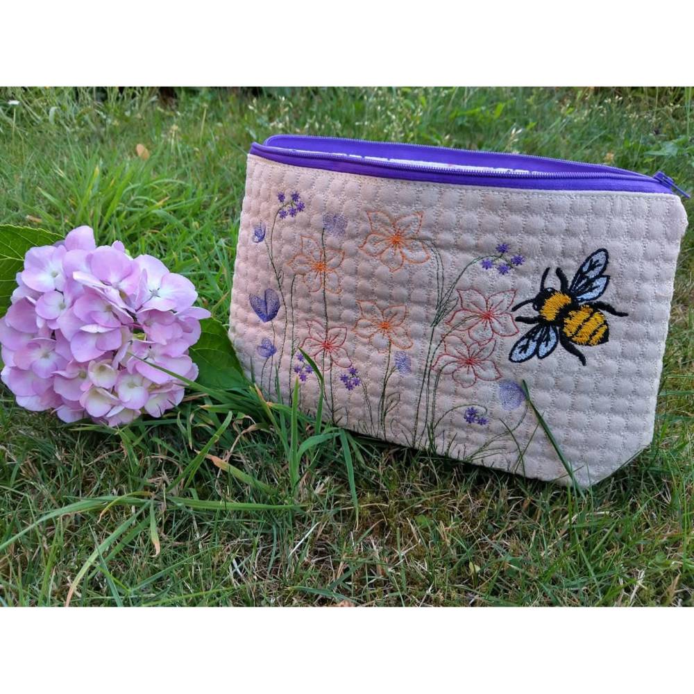 Die kleine Biene wurde sehr natürlich dargestellt. Die Flügel sind sehr filigran in zwei Farben gearbeitet und können optional mit Stickfolie unterlegt werden, damit sie glänzen. Aber die Unterlage aus weiß und das Relief in hellblau wirken schon lebensecht. Auch der Körper der Biene wurde detailreich dargestellt, das gelb/orange des Körpers wirkt durch leicht unregelmäßige Stiche etwas flauschig. Der restliche schwarze Körper ist wohlkonturiert und teils in Satin gelegt.