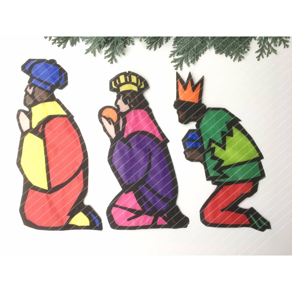 die farbigen Fotos dienen NUR als Farbbeispiel, wie toll die Krippenszene mit Transparentpapier beklebt aussieht!