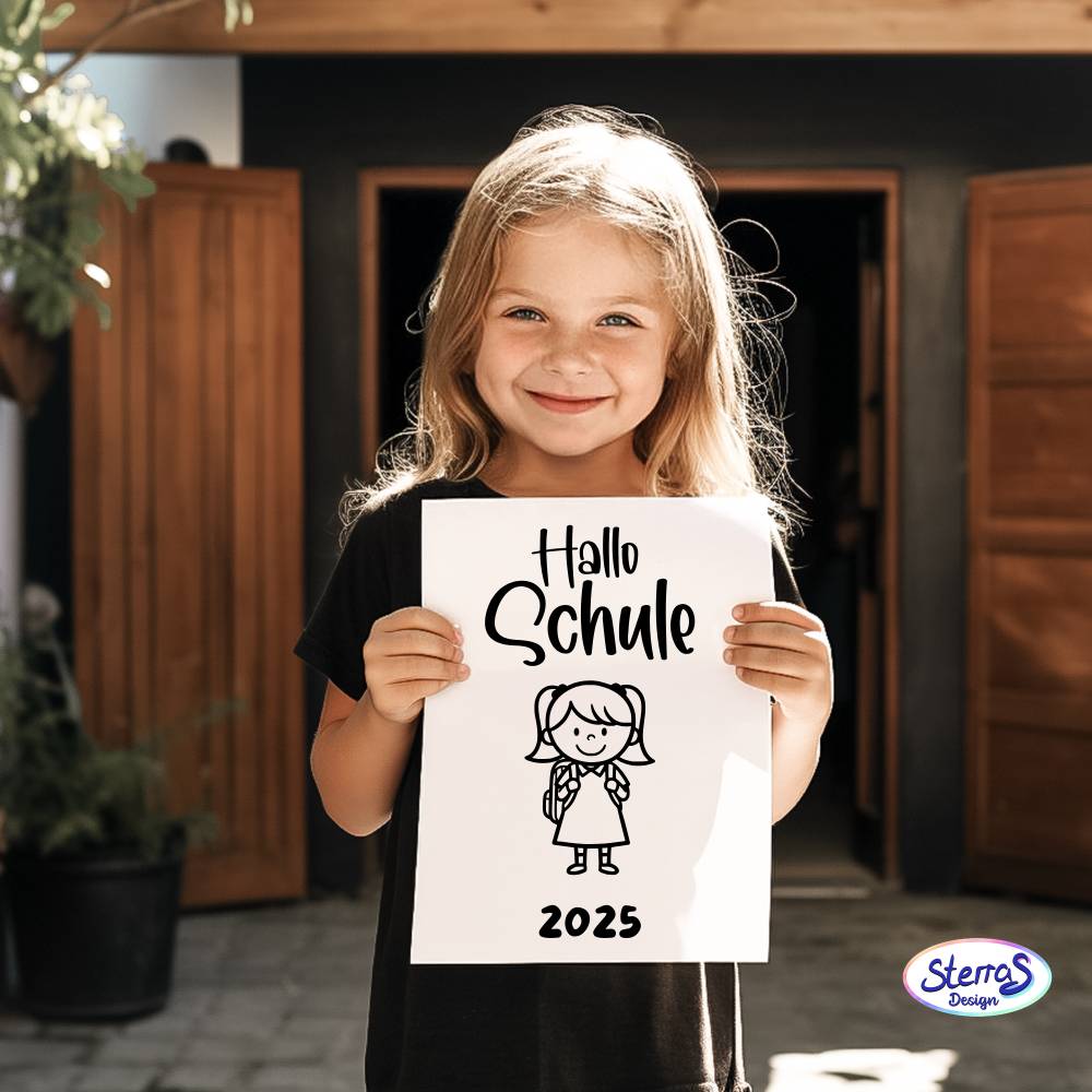 Enthalten sind beliebte Sprüche wie „Auf ins neueAbenteuer“, „3, 2, 1, Schule“, „Hurra, erste Klasse“ oder „Endlich Schulkind“.Ergänzend gibt es Motive wie Schultüten in verschiedenen Designs, Kinder mitRucksäcken, Papierflieger, Tafel und Stifte.