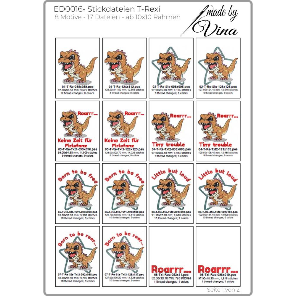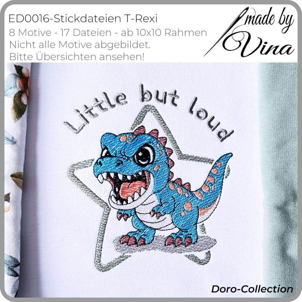 Erwecke Deine Nähprojekte mit dem frechen T-Rexi im angesagten Shabby-Stil zum Leben! Diese einzigartige Stickdatei-Kollektion wurde in liebevoller Kooperation mit Doro Schulenberg (Doro-Collection) entwickelt und bringt Action und Kreativität auf Kinderkleidung, Kissen, Taschen und vieles mehr.