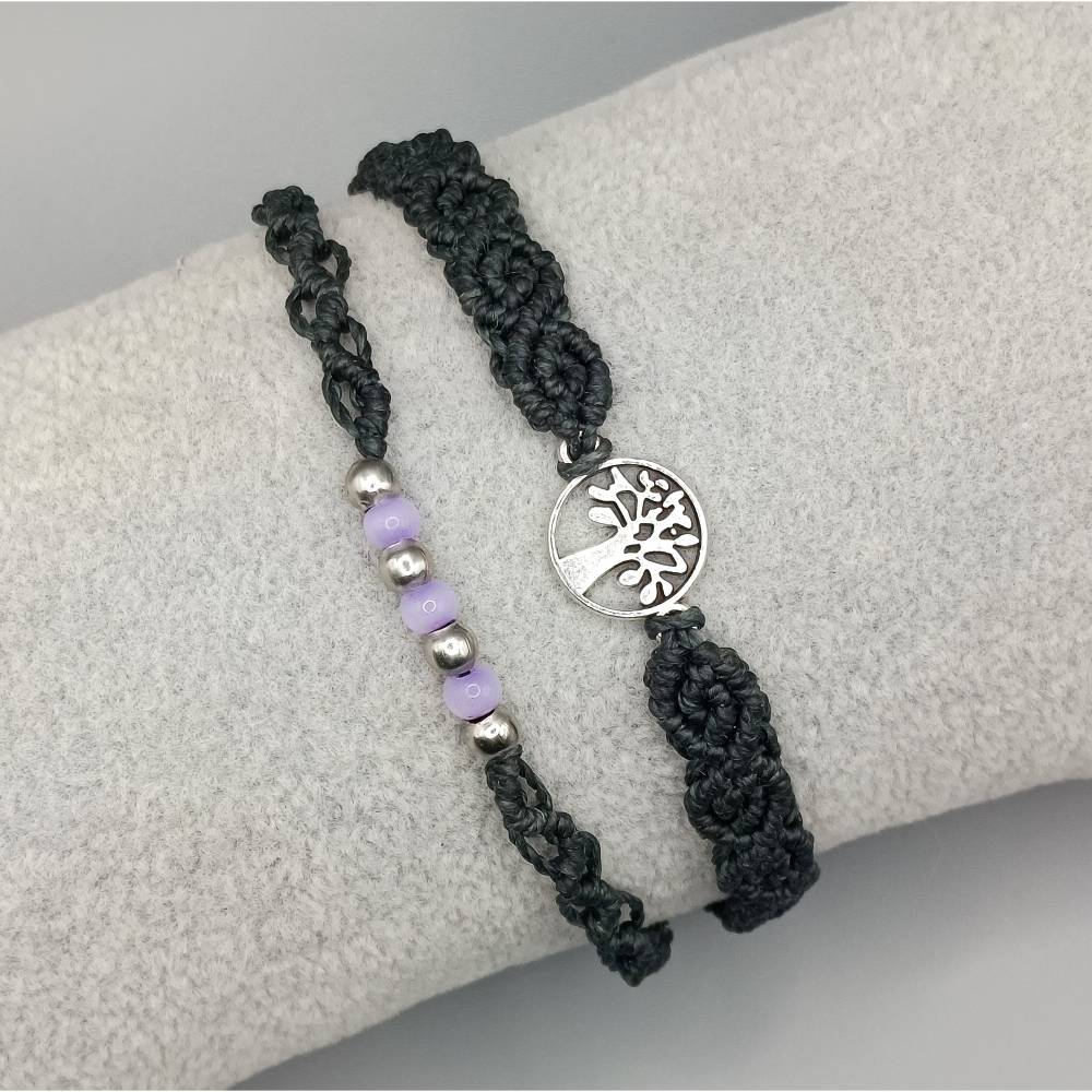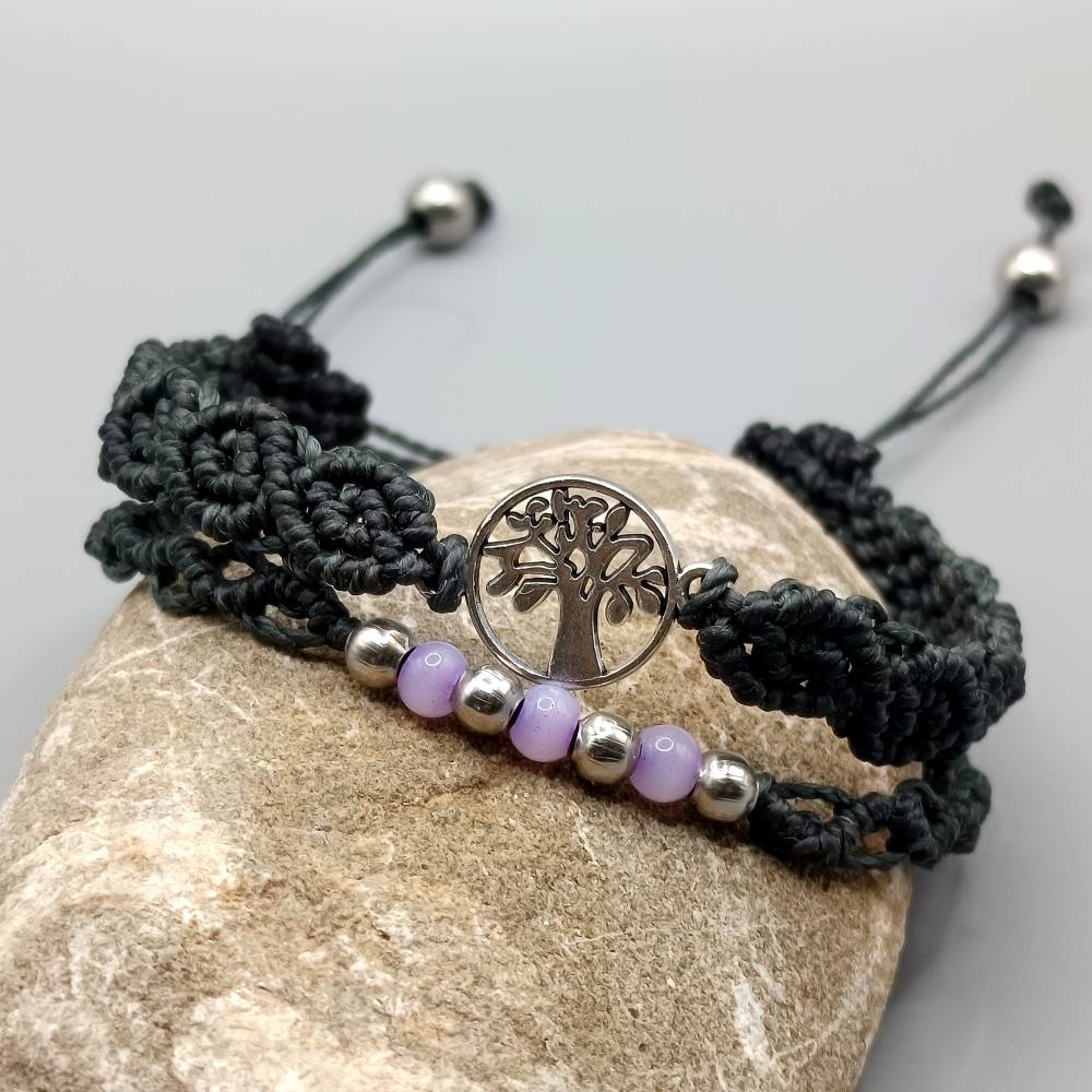 Makramee Armband 2in1 in schwarz mit silberfarbenem Lebensbaum sowie kleinen Acryl- und Edelstahlperlen