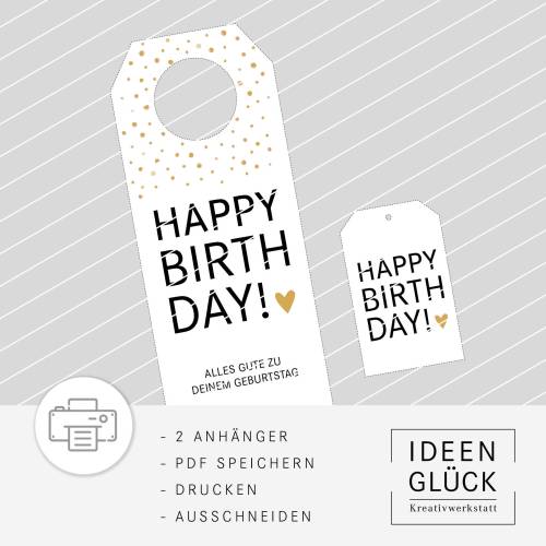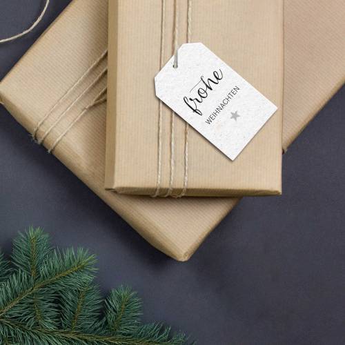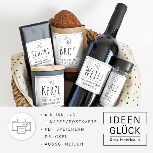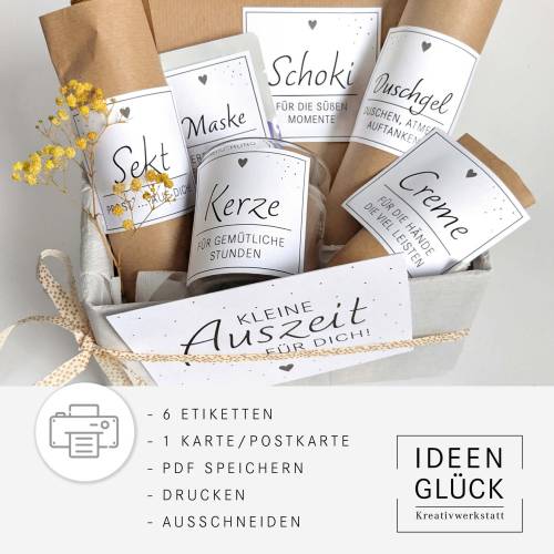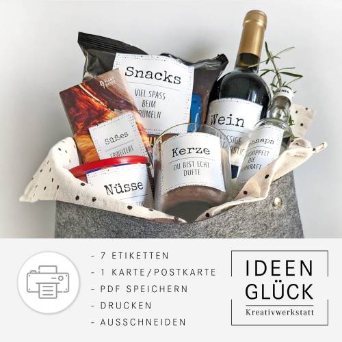Die Datei enthält eine PDF-Vorlage mit zwei Seiten im A4-Format (21 x 29,7 cm) und kann auf Aufkleberpapier oder Fotopapier im Copyshop oder bequem am heimischen Drucker gedruckt werden. Nach dem Ausschneiden kannst du mit einem Locher oder Lochzange ein Loch in eine Ecke des Labels machen, um ein Geschenkband einzufädeln.