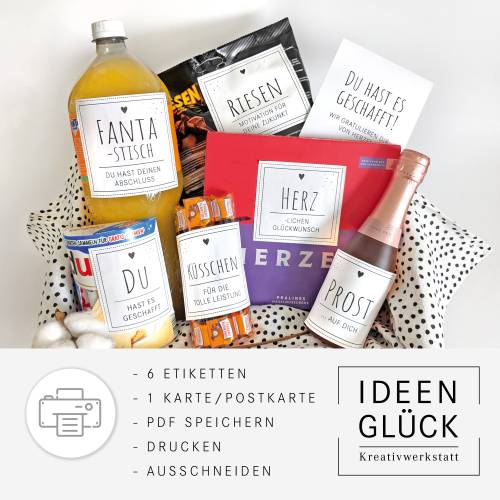 Enthalten sind 6 Labels/Etiketten für Autozubehör, Getränk und Süßigkeiten, sowie eine Postkarte bzw. Klappkarte in A6.
