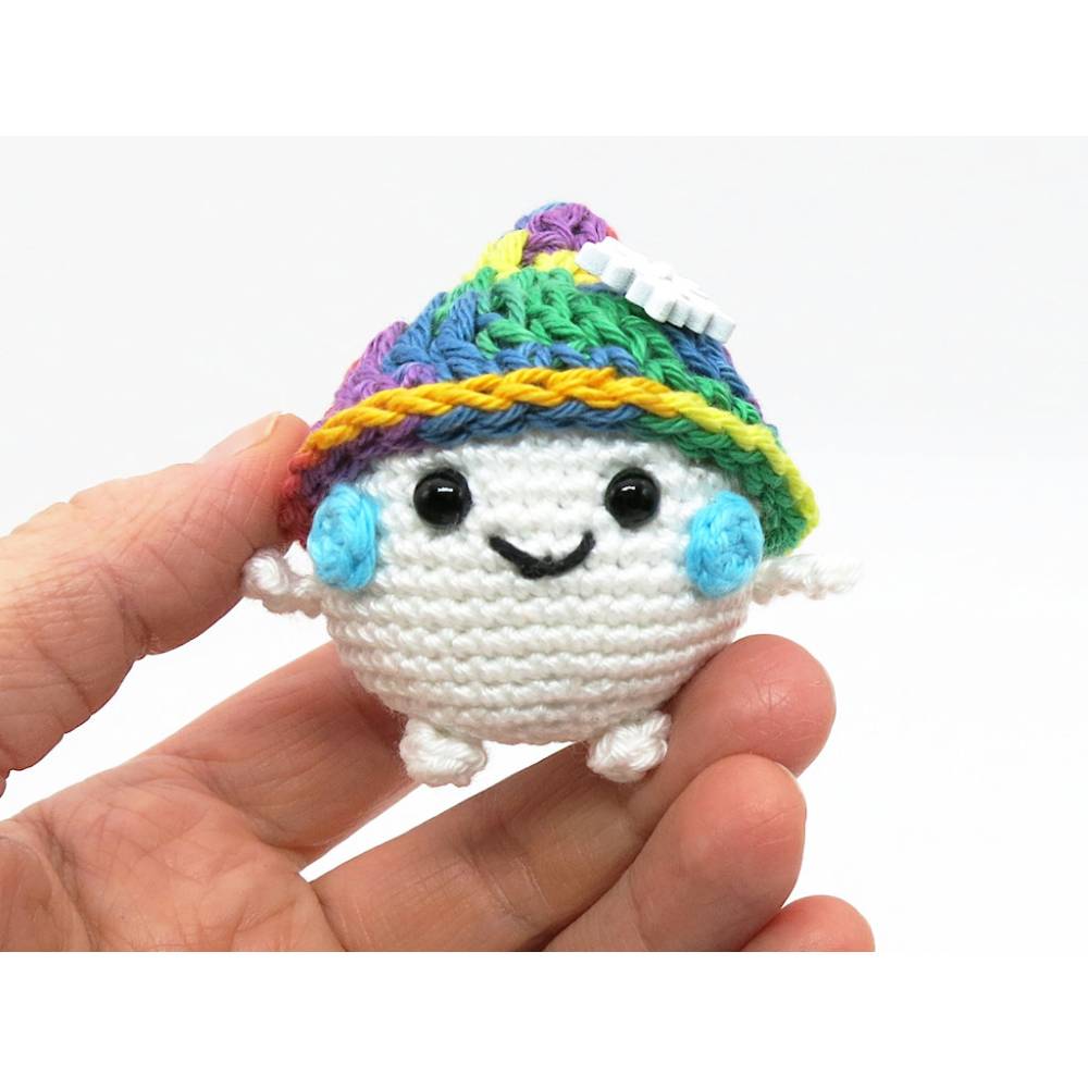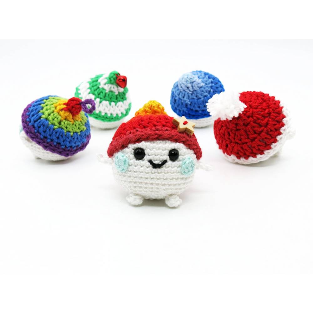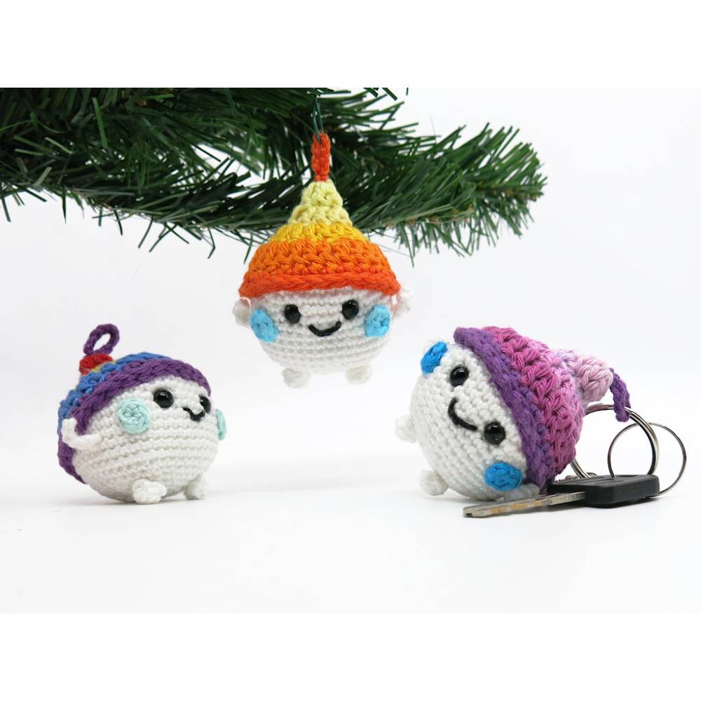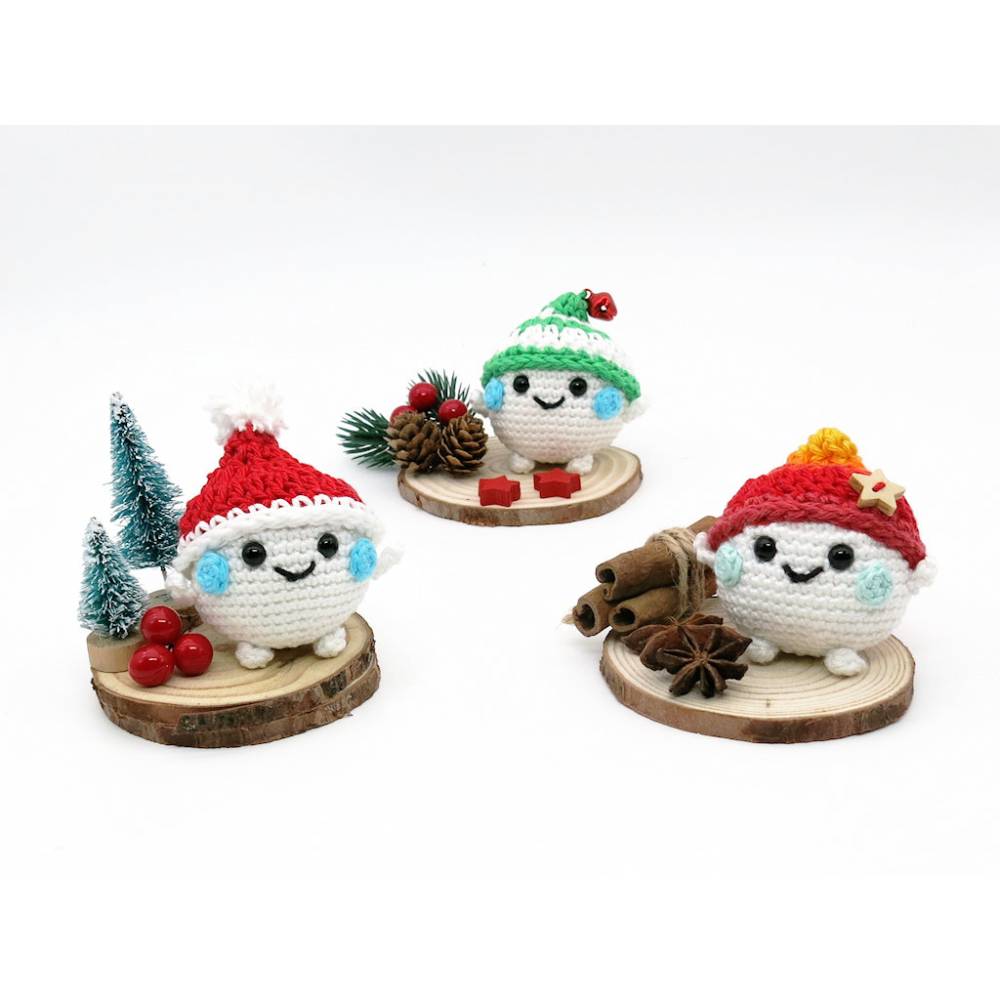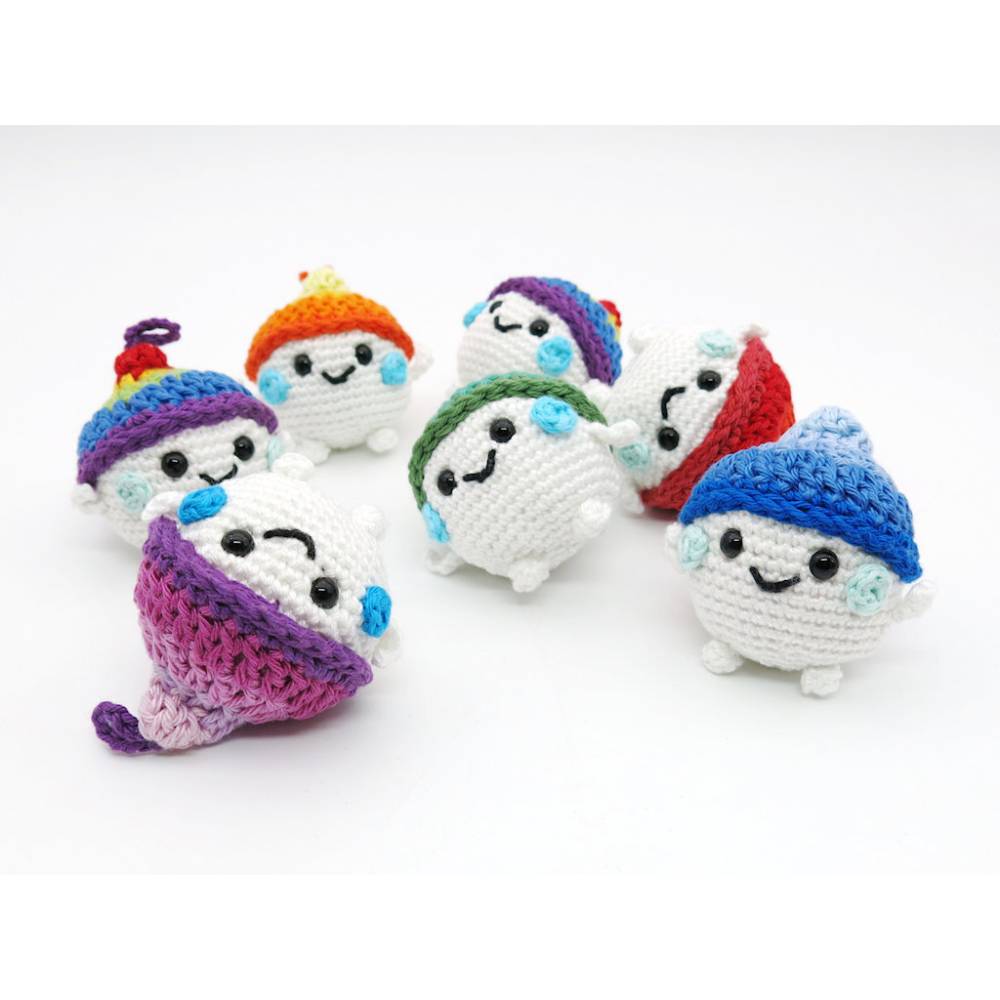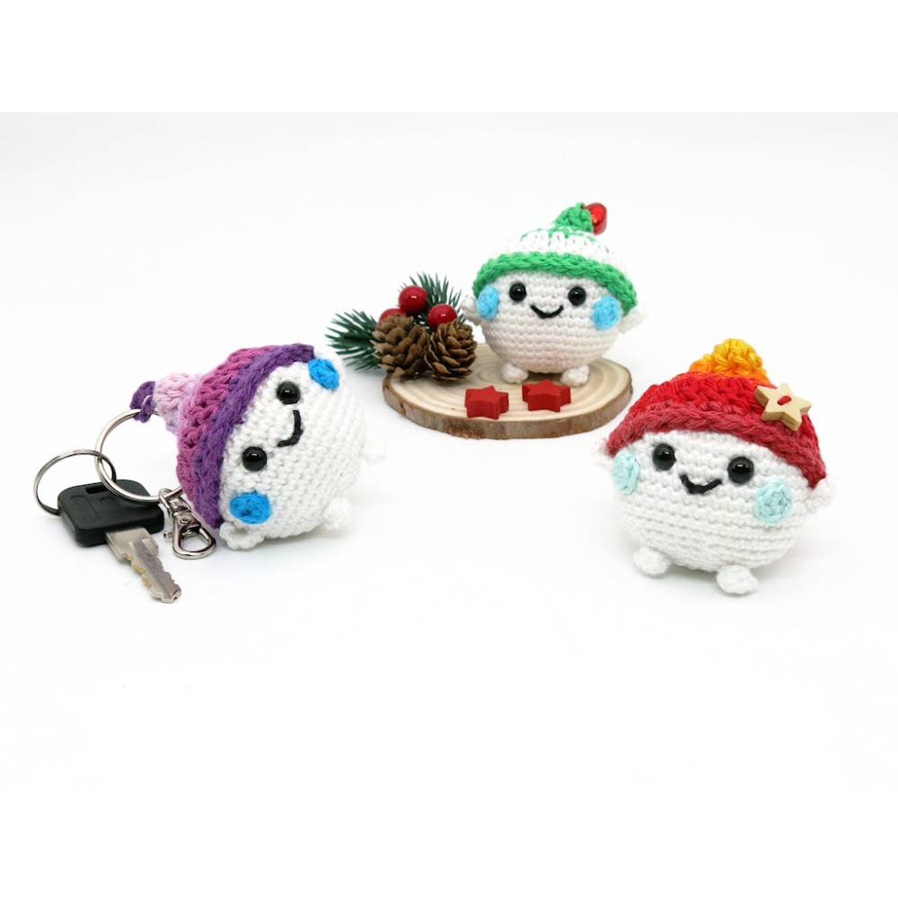 DerSchneeball wird in fortlaufenden Runden/Spiralen gehäkelt, die Mützein geschlossenen Runden und die Arme & Füße vor und zurück inReihen.