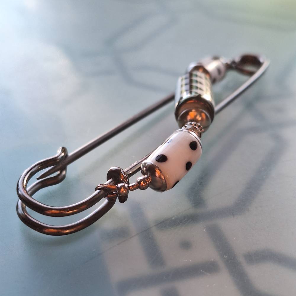 In den Mittelpunkt der kräftigen, 10cm langen Schalnadel habe ich hier eine Walzenperle aus hochwertig glasiertem Porzellan mit geometrischem Dreiecksmuster gestellt. Als Ergänzung dazu zwei weiße Glasperlen mit lebendigen Dalmatiner Tupfen.Kombiniert habe ich die besondere Gruppe mit minimalistischen Silberelementen und einem Hauch von funkelndem Strass, so ist ein ausdrucksstarkes und klares Schmuckstück entstanden.