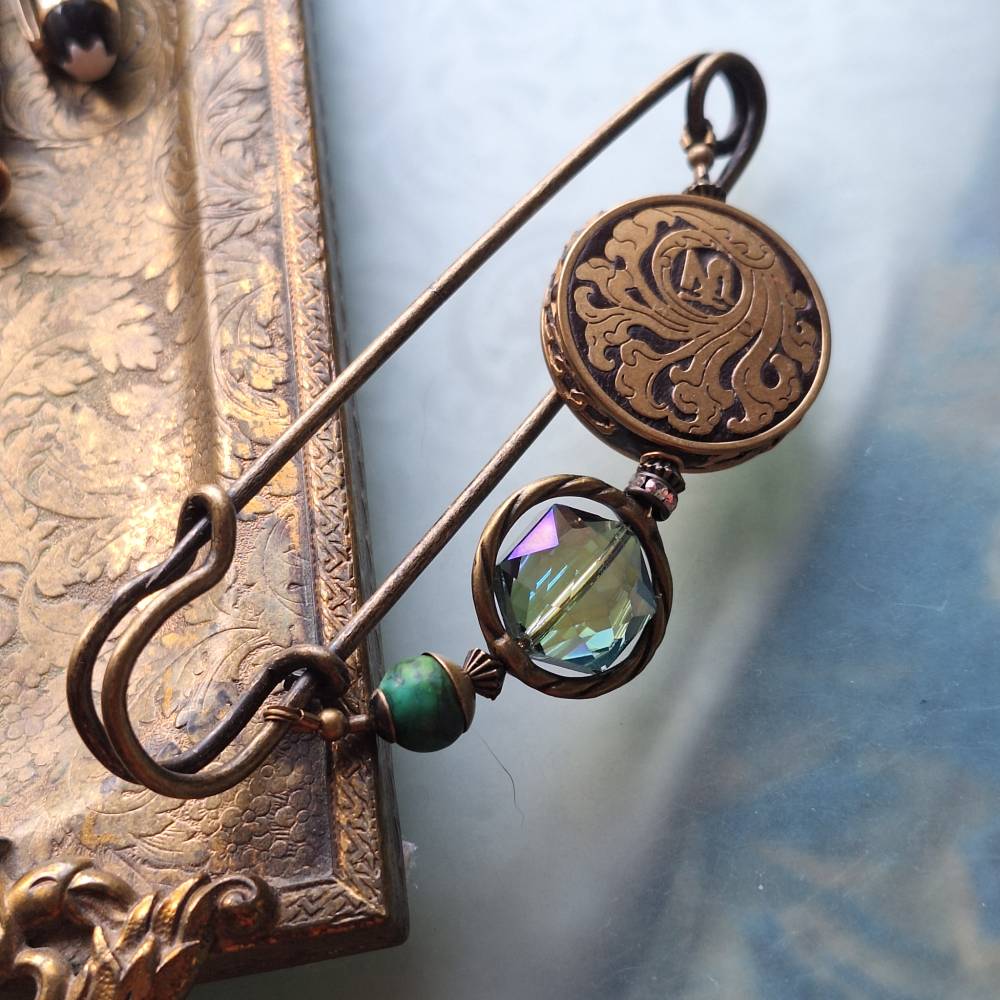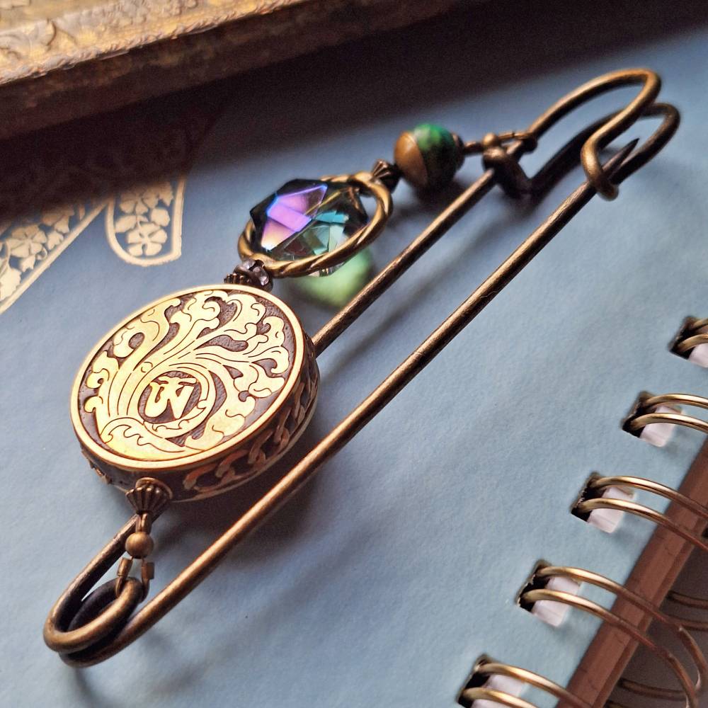 Die 10cm lange XXL Kiltnadel habe ich hier mit einem märchenhaft dekorativen Schmuckelement versehen. Im Zentrum steht eine große flache Kunstharzperle mit beidseitig eingelegten wunderbar verschlungenen Messingornamenten in deren Mittelpunkt das Mantra Symbol eingebettet ist.Om (auch Aum; Sanskrit: ॐ ) ist eine Silbe, die bei Hindus, Jainas und Buddhisten als heilig gilt. Der Klang steht für den transzendenten Urklang, aus dessen Vibrationen nach hinduistischem Verständnis das gesamte Universum entstand.