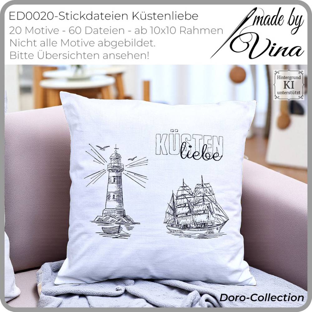 Dieses Set ist ein Herzensprojekt aus kreativer Zusammenarbeit: Doros liebevolle Entwürfe und Digitalisierungen kombiniert mit technischer Umsetzung und Feinschliff ergeben einzigartige, mit Herz gestaltete Stickdateien. Lass dich inspirieren und bringe mit „Küstenliebe“ das Meer auf deine Stickprojekte!