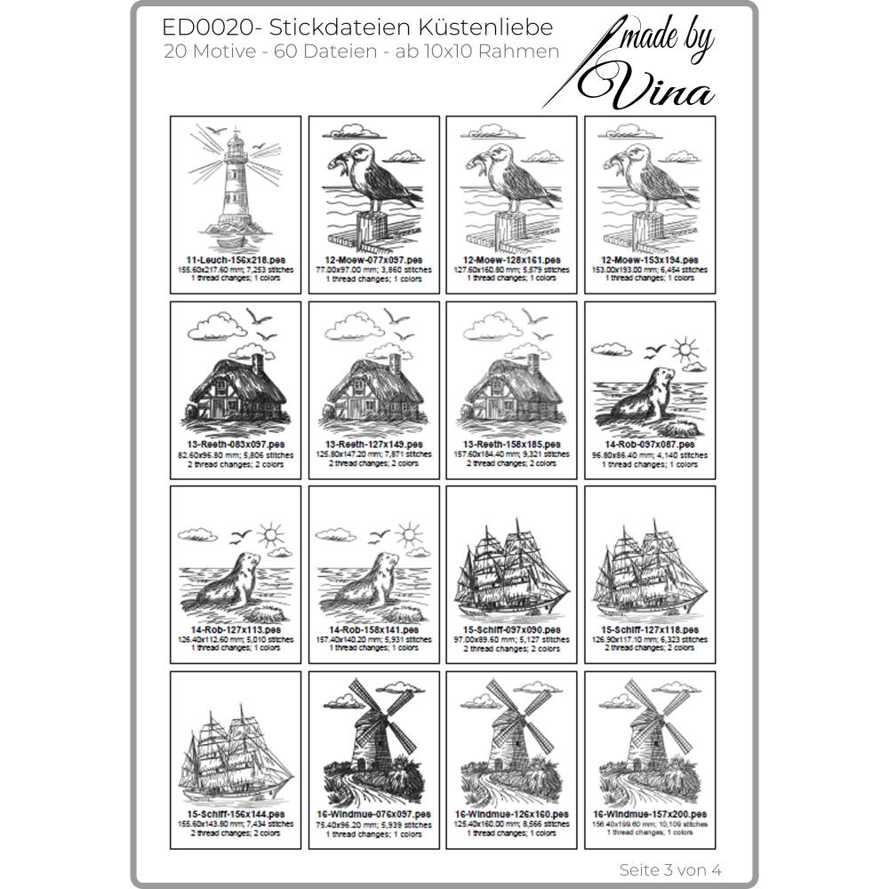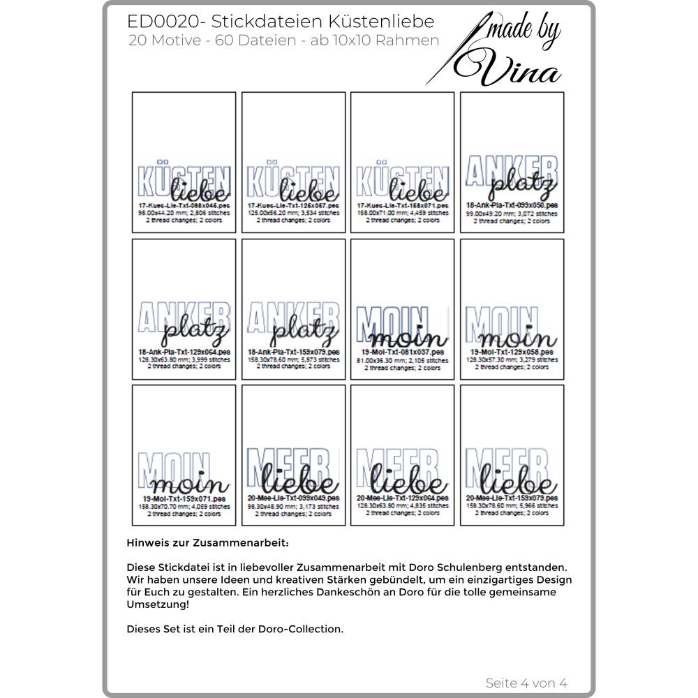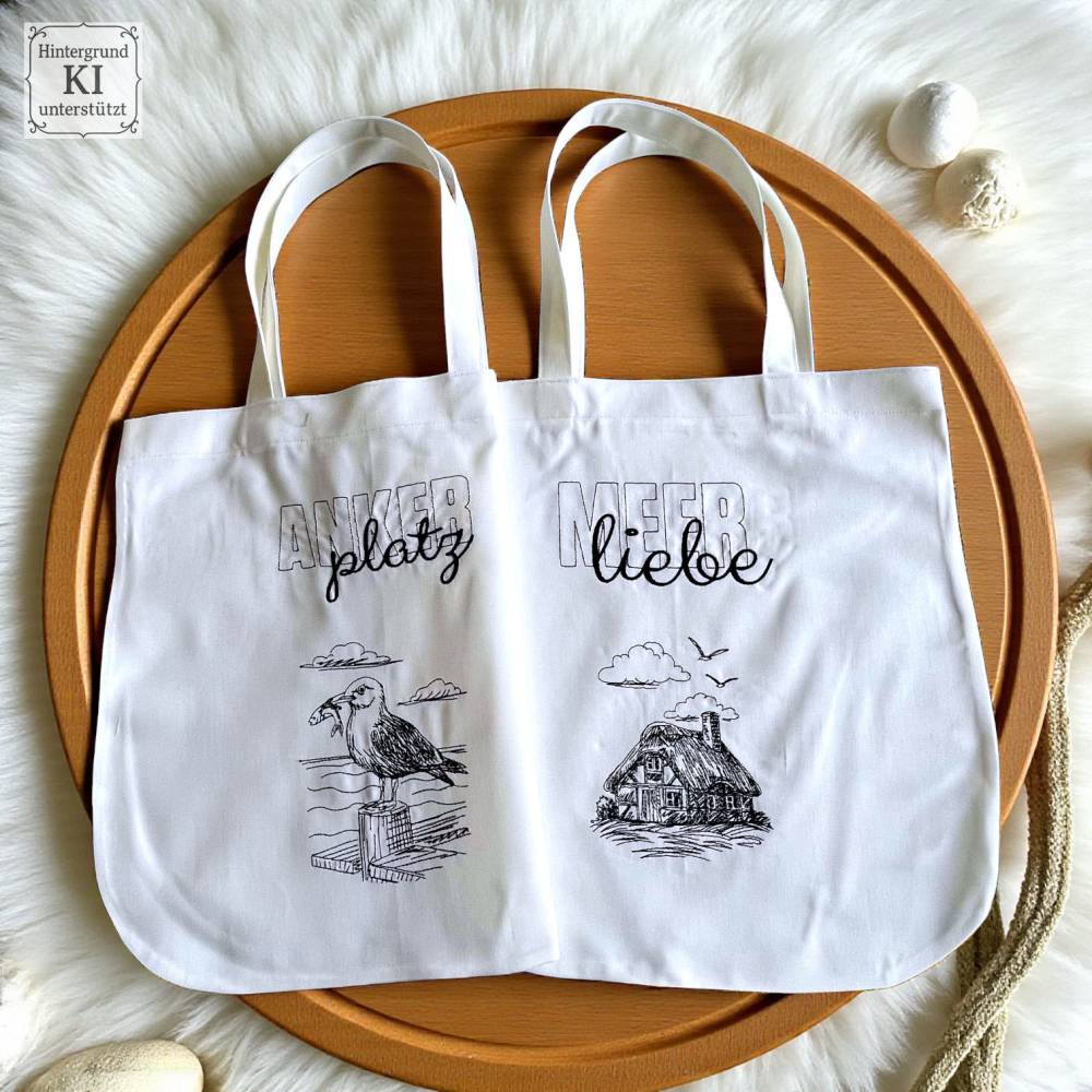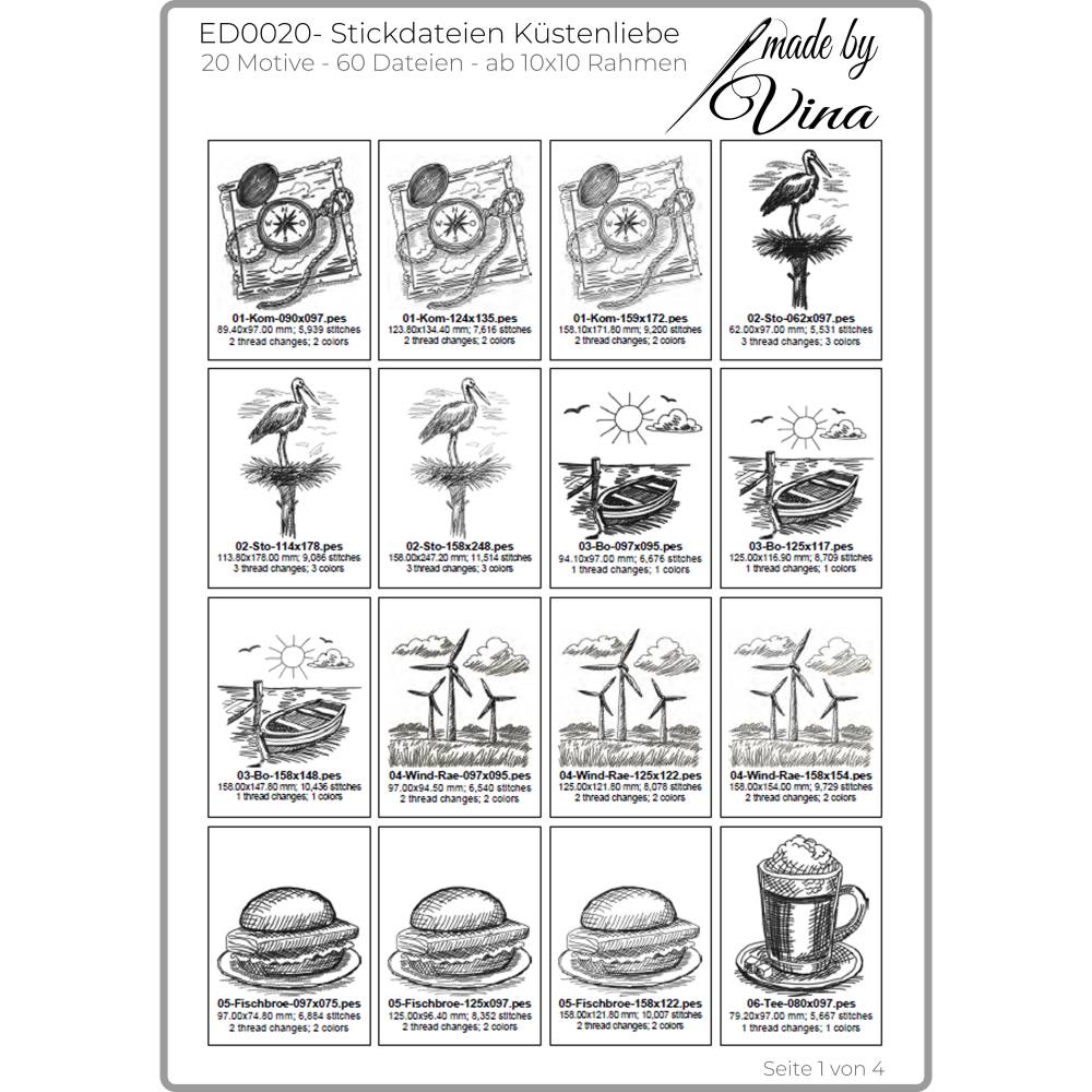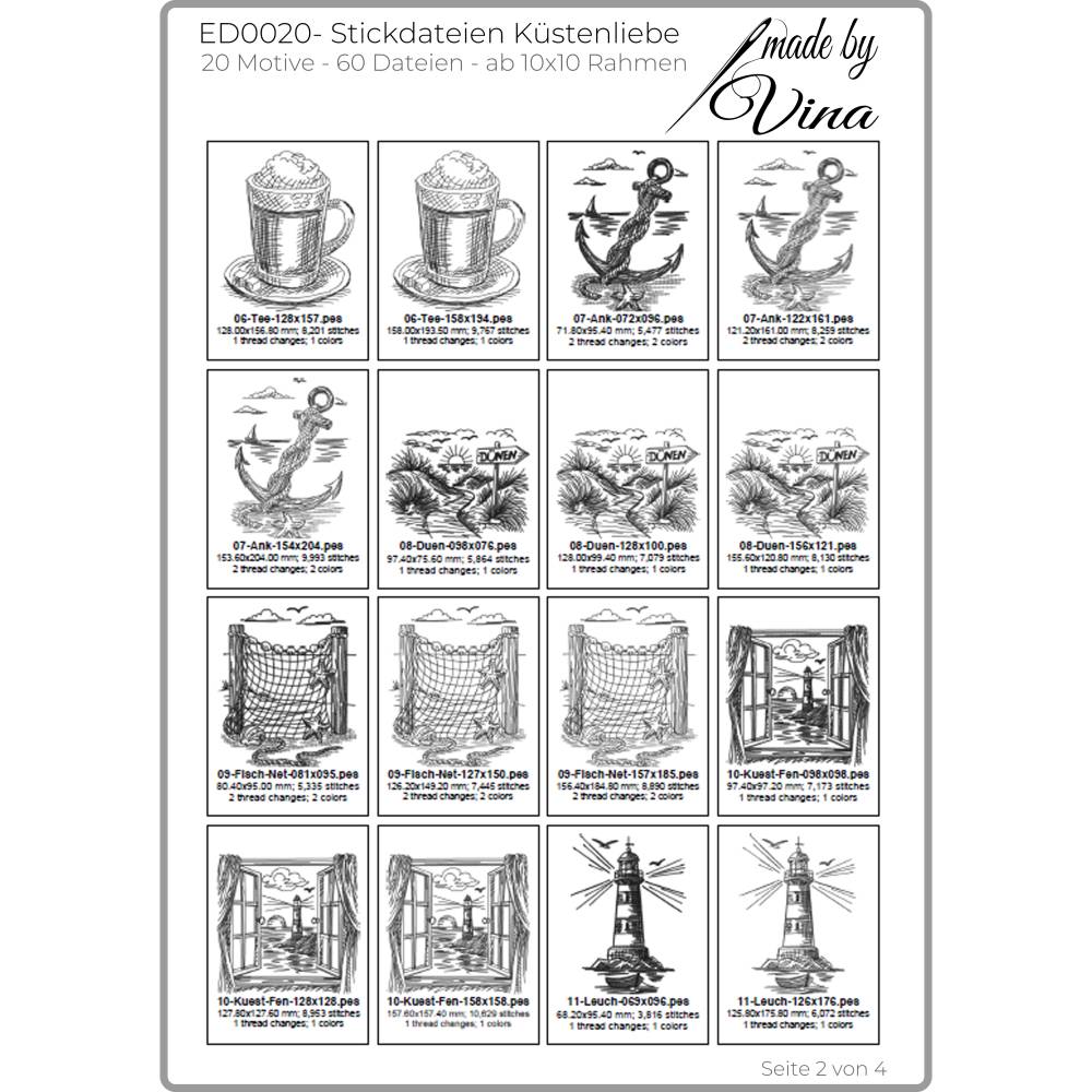 Die Stickdateien sind ab 10x10 Rahmen geeignet und perfekt für Taschen, Kissen, Deko oder deine ganz eigenen Ideen rund ums Meer. 20 Motive und 60 Dateien warten auf dich – inklusive kreativen Schriftzügen wie „Küstenliebe“, „Moin“, „Meerliebe“ und „Ankerplatz“.