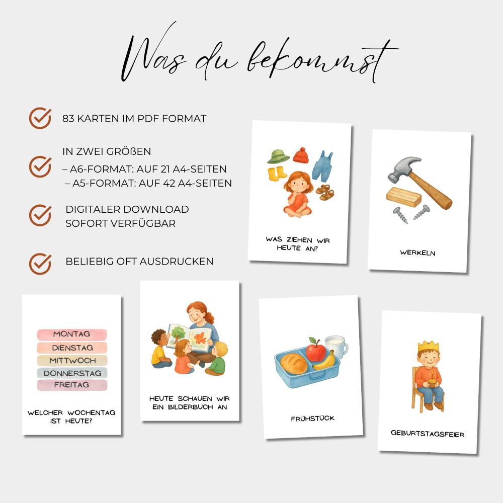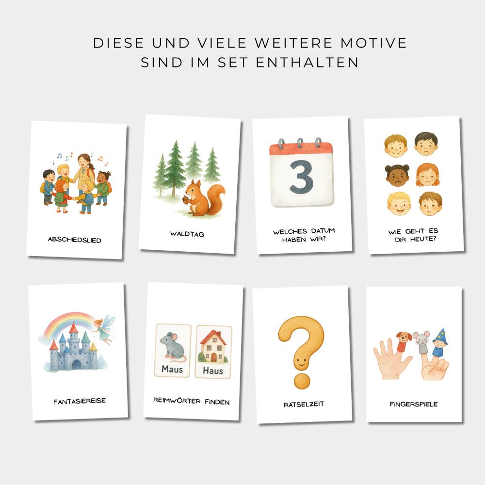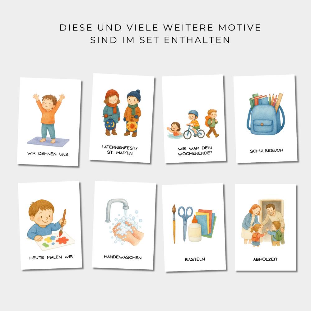 Dieses Set enthält 83 farbenfrohe Bildkarten zur Darstellung des Tagesablaufs in Kita, Krippe, Kindergarten oder der Vorschule. Die Karten helfen Kindern, sich im Tagesgeschehen besser zu orientieren und geben Sicherheit durch klare Strukturen. Sie sind ideal für den Einsatz im Morgenkreis, an der Wand oder am Tagesplan-Board geeignet.