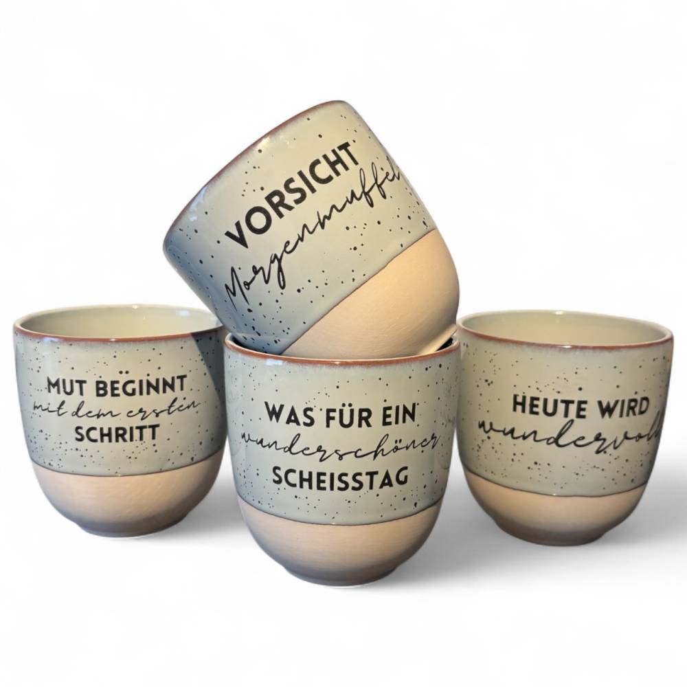Mit unseren gravierten Keramikbechern bringst du nicht nur Kaffee oder Tee auf den Tisch, sondern auch Persönlichkeit und Humor. Wähle aus einzigartigen Sprüchen wie „Vorsicht Morgenmuffel“, „Mut beginnt mit dem ersten Schritt“, „Was für ein wunderschöner Scheisstag“ oder „Heute wird wundervoll“.