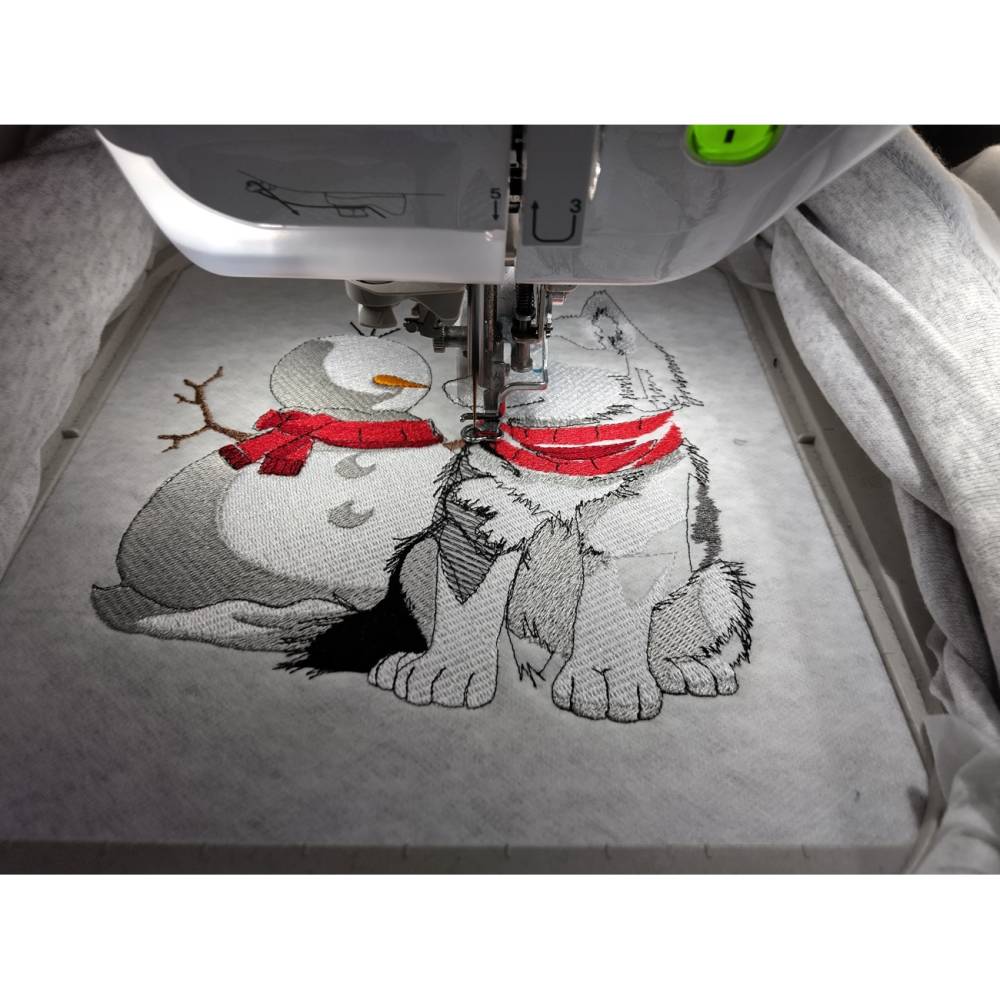 Stabilisiere das Motiv gut und genieße Stickspaß in der kühleren Jahreszeit – Husky und Schneemann warten auf Dich!
