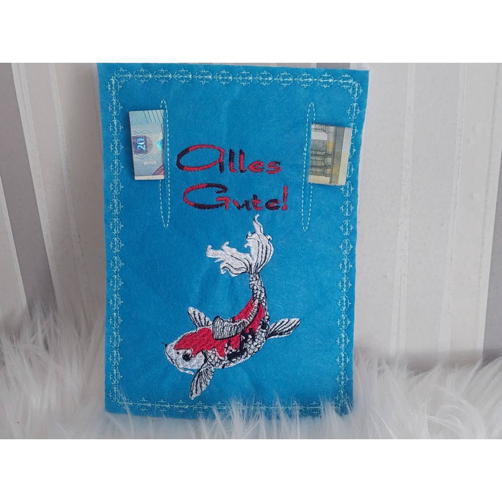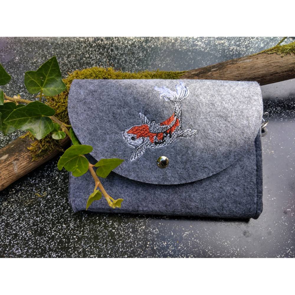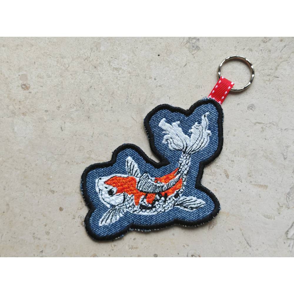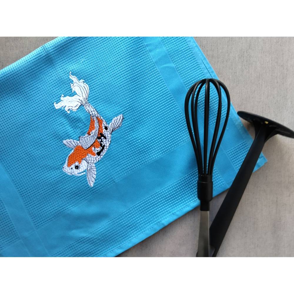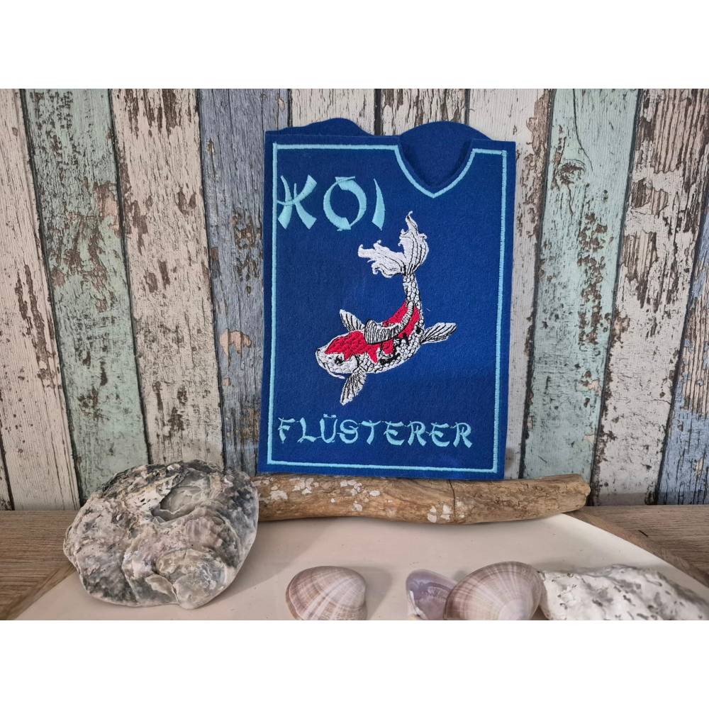 Das Muster ist vielseitig einsetzbar und lässt sich auf verschiedensten Hintergrundfarben sticken. Auf Blau wirkt der Koi besonders lebendig und scheint durch Wasser zu gleiten.