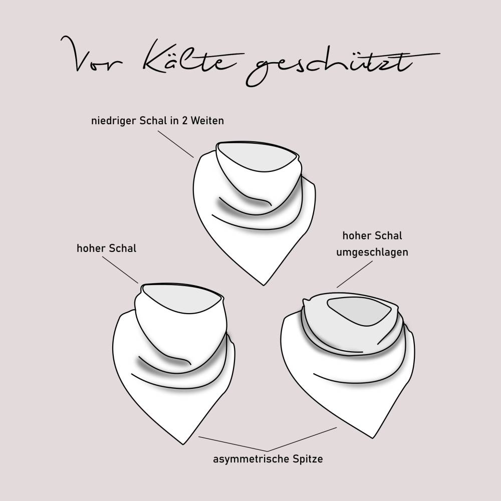 Dieser Schnitt für ein Dreieckstuch in Loopschalform, aus diversesten Materialien nähbar, mit 2 Höhen und 2 Weiten für schmückende Tücher oder kuschelige Schals, trägt den schönen Namen "Vor Kälte geschützt". Das Schnittmuster beinhaltet natürlich eine ausführliche Anleitung und wird dir nach dem Kauf als Sofort Download in PDF Format zur Verfügung gestellt. 「Die Einzelheiten」