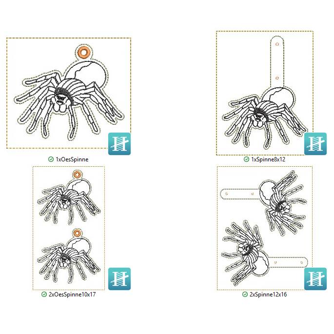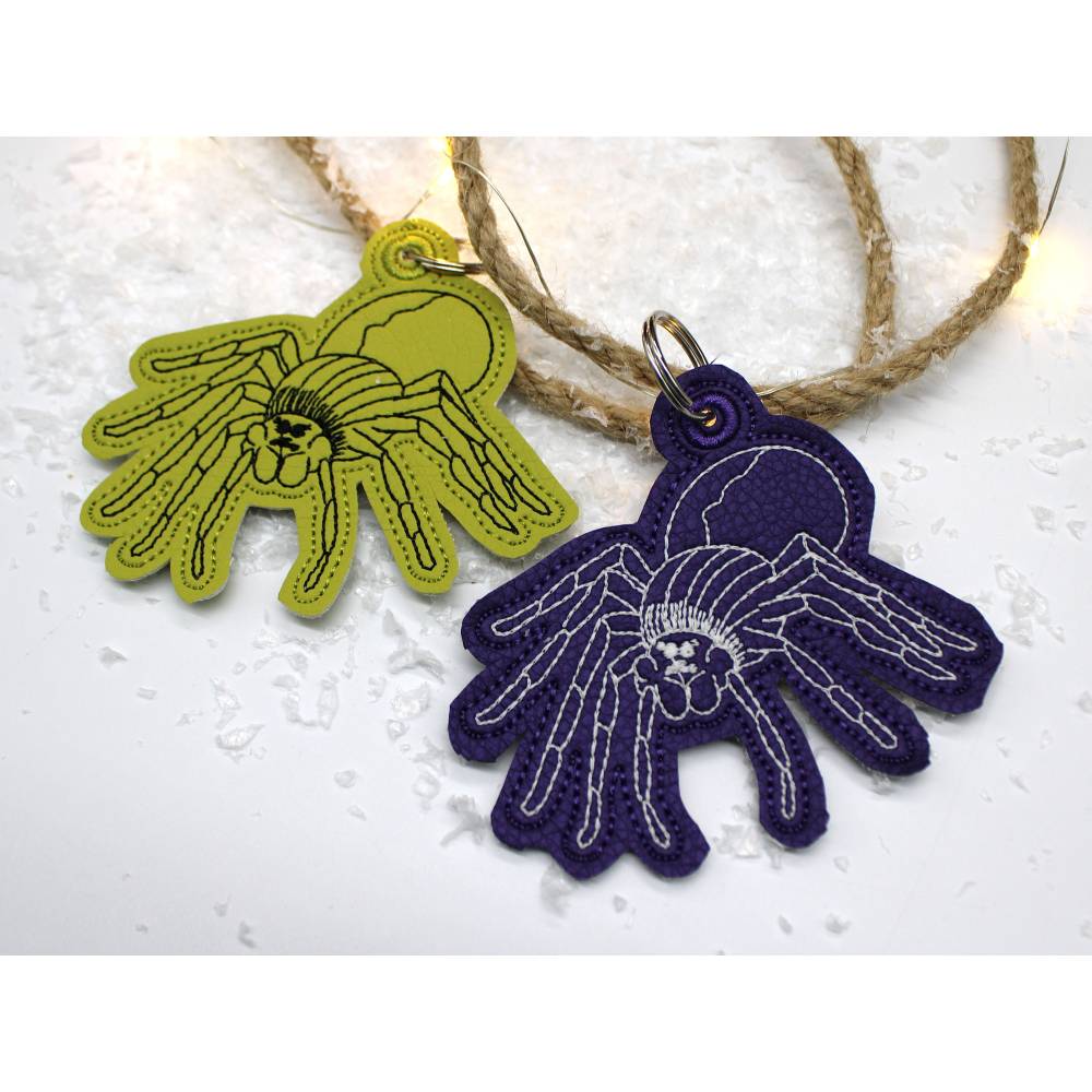 Ich habe ein Garn "Glow in de the dark" auf dunklem Kunstleder verwendet, so leuchtet die Spinne im Dunkeln und gibt einen extra Gruselefekt.