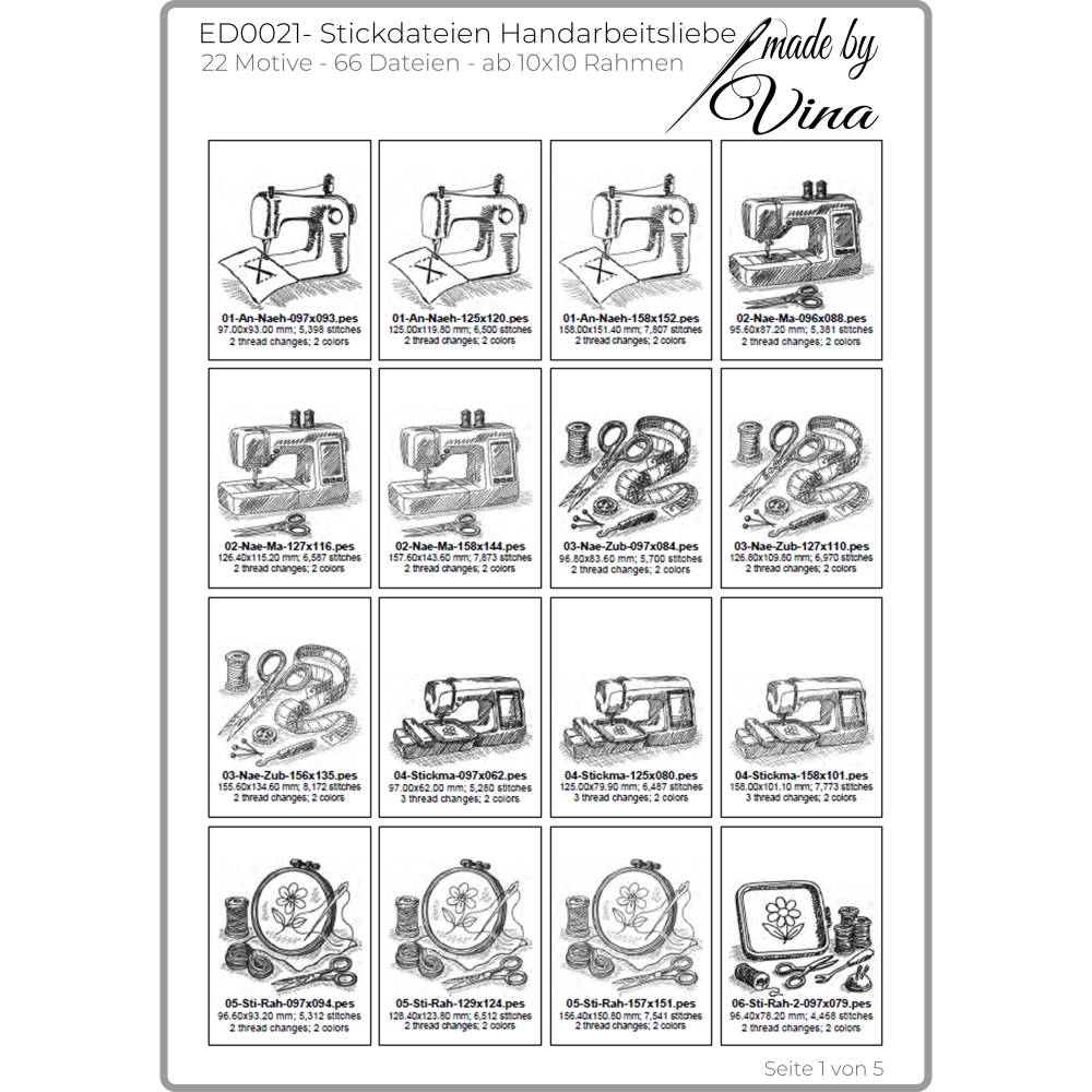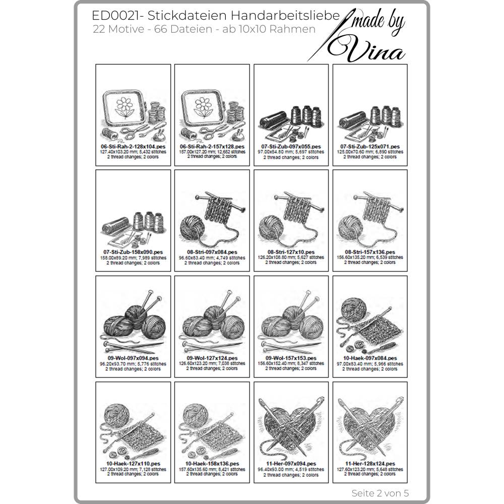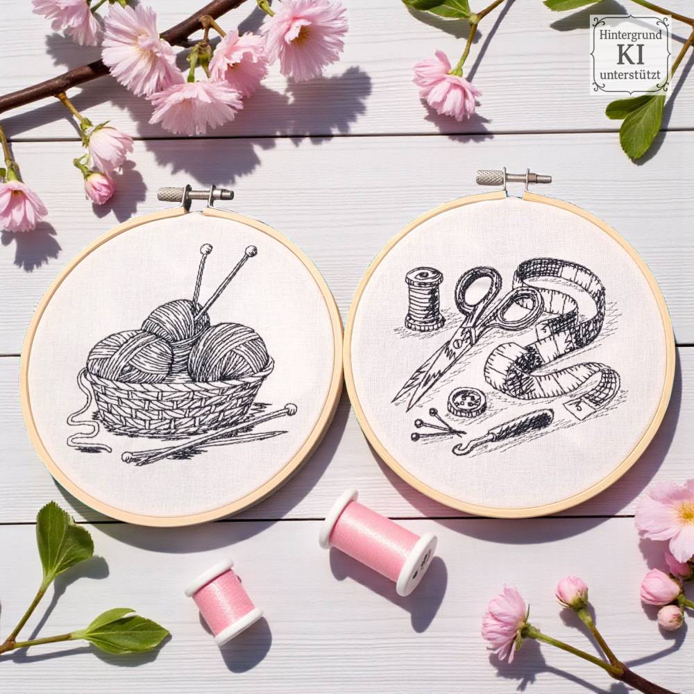 Mit diesem einzigartigen Stickdateien-Set zeigst du deine Liebe zum Nähen, Sticken, Häkeln, Stricken oder Plotten. In diesem Paket erwarten dich 22 detailreiche Motive rund um Handarbeit: von Garnrollen und Nähmaschinen über Stickrahmen bis hin zum Wollkorb – jedes Design spiegelt die Leidenschaft für kreative Handarbeiten wider.