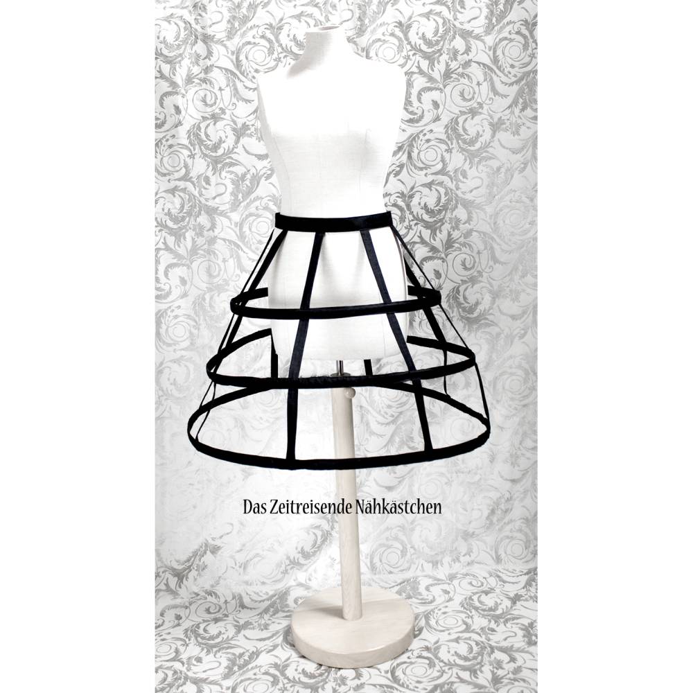 Mit diesem kurzen Käfig-Reifrock erhältst Du eine leichte, stabile und vielseitige Alternative zum klassischen Petticoat. Die Mini-Crini-Krinoline ist perfekt geeignet, um kurzen Röcken und Kleidern Volumen zu verleihen – ideal für Lolita Fashion, 50er Kleider als Alternative zum Tüll-Petticoat, Gothic- oder Bühnenoutfits. Gleichzeitig ist sie so dekorativ gearbeitet, dass sie auch solo getragen ein absoluter Hingucker ist.