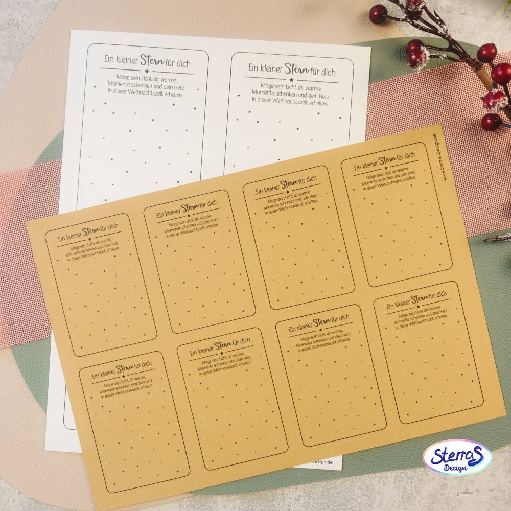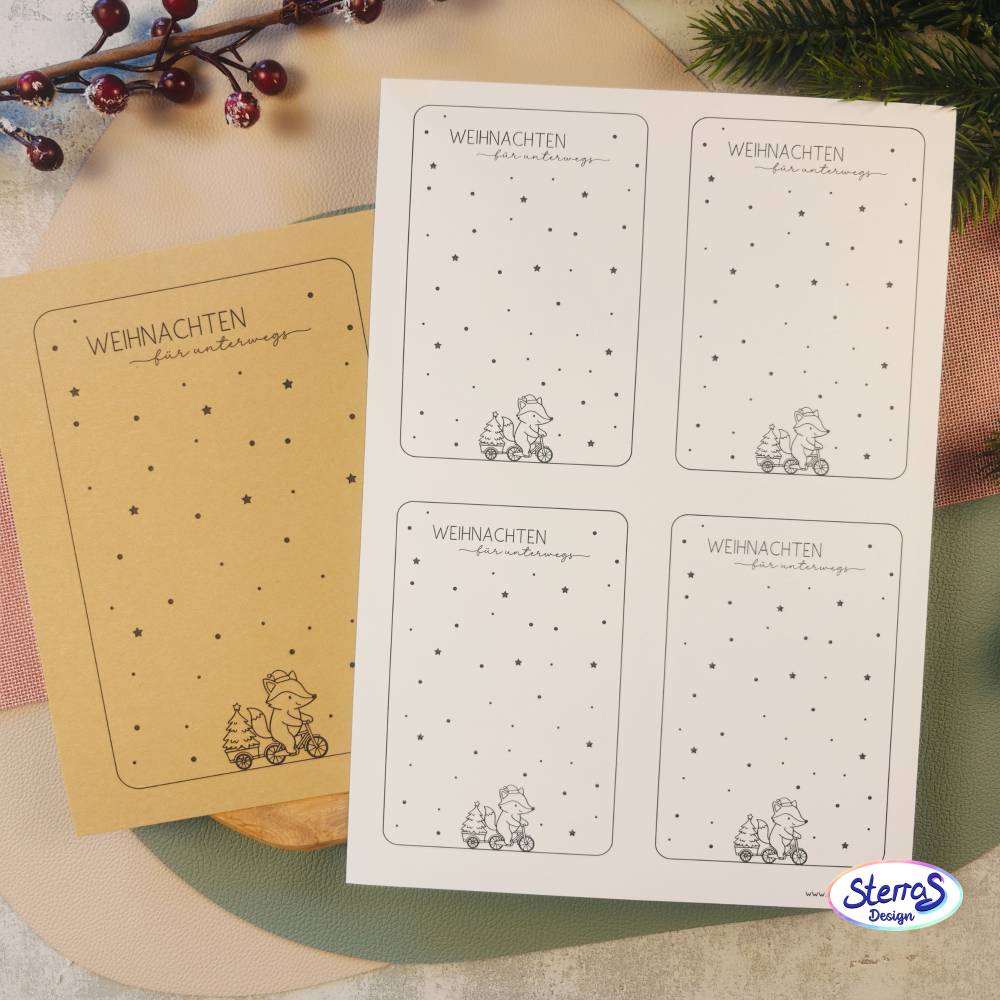 Dieses Set enthält zwei digitale Geschenkkarten-Vorlagen fürWeihnachten: „ein kleiner Stern für dich“ (J000085) und „Weihnachtenfür unterwegs“ (J000054). Beide Motive sind im klaren Kraftpapier-Lookgestaltet und passen besonders gut zu kleinen Geschenken, Adventskalendern oderMitbringseln in der Vorweihnachtszeit.
