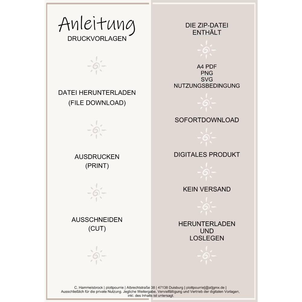Die hochauflösende und vielseitig einsetzbare Datei ist sofort nach Zahlung als digitaler Download verfügbar. Es wird kein physischer Artikel versendet, du erhältst die gesamte PDF-Datei in Din A4