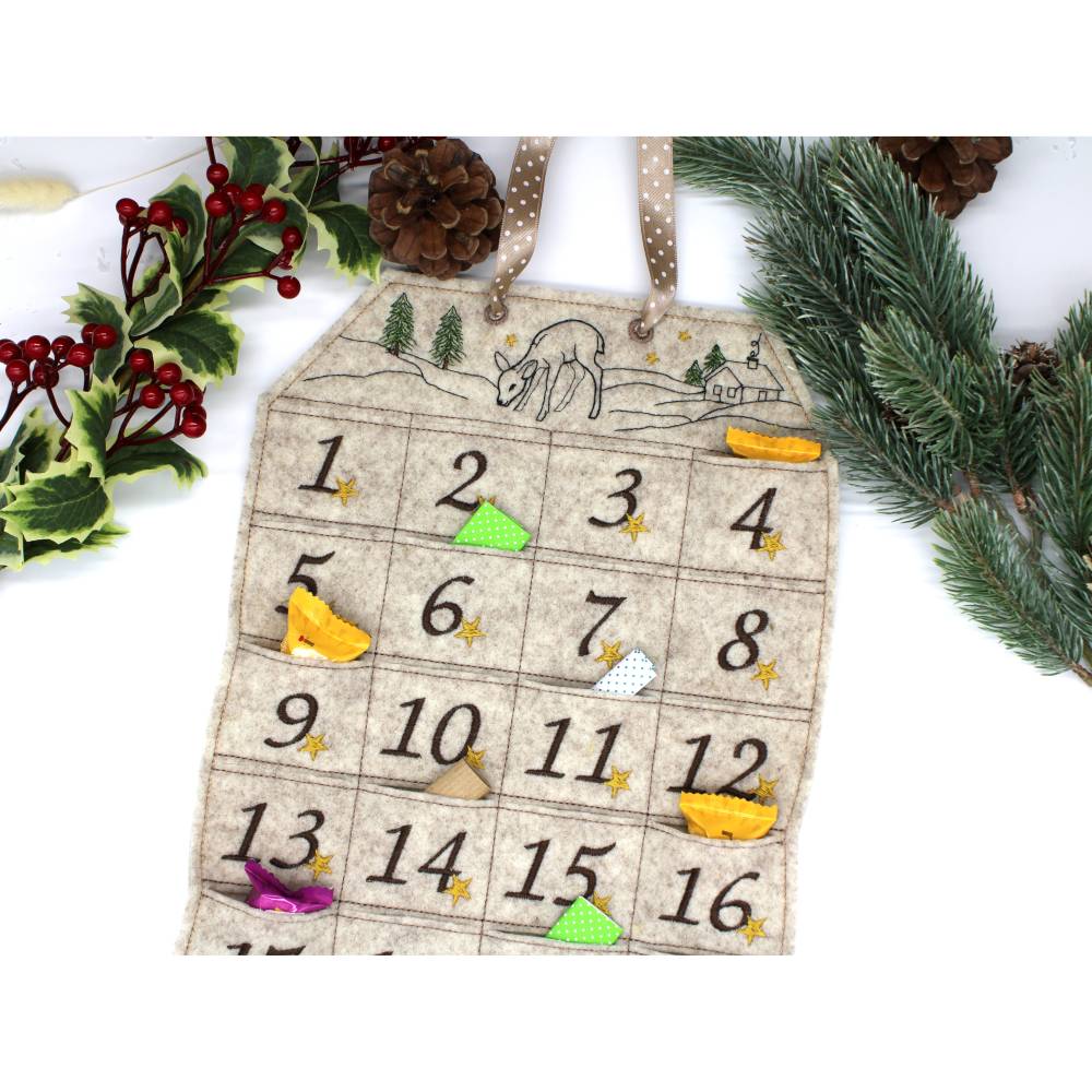 Ein Adventskalender, der komplett im Rahmen gefertigt wird. In die 24 kleinen Einsteckfächern lassen sich kleine Mini-Schokotafeln oder Wünsche verstecken. Am Kopf des Kalenders wird ein kleines Reh im Wald aufgestickt und verbreitet urige Gemütlichkeit.