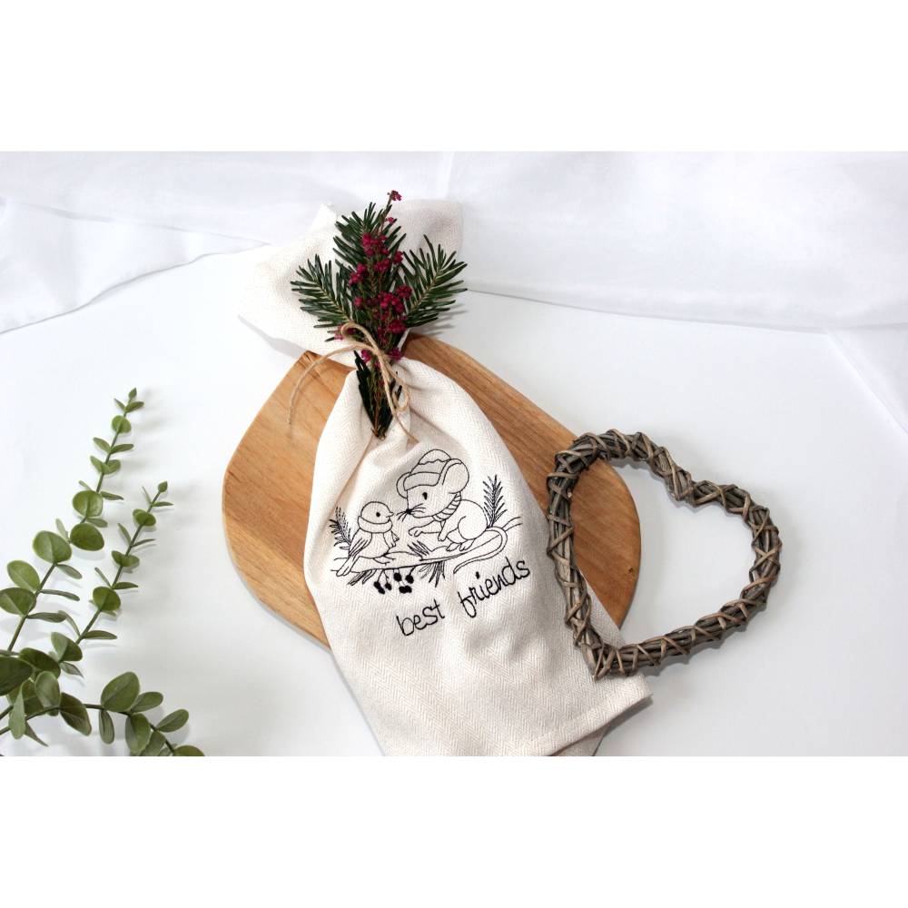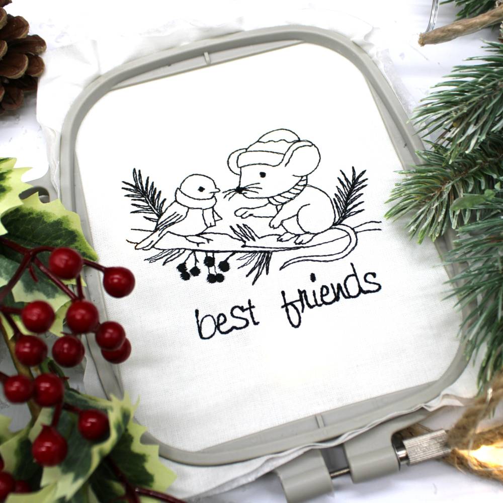Süße Stickdatei mit einem kleinen Spatz und seinem besten Freund, der Maus.