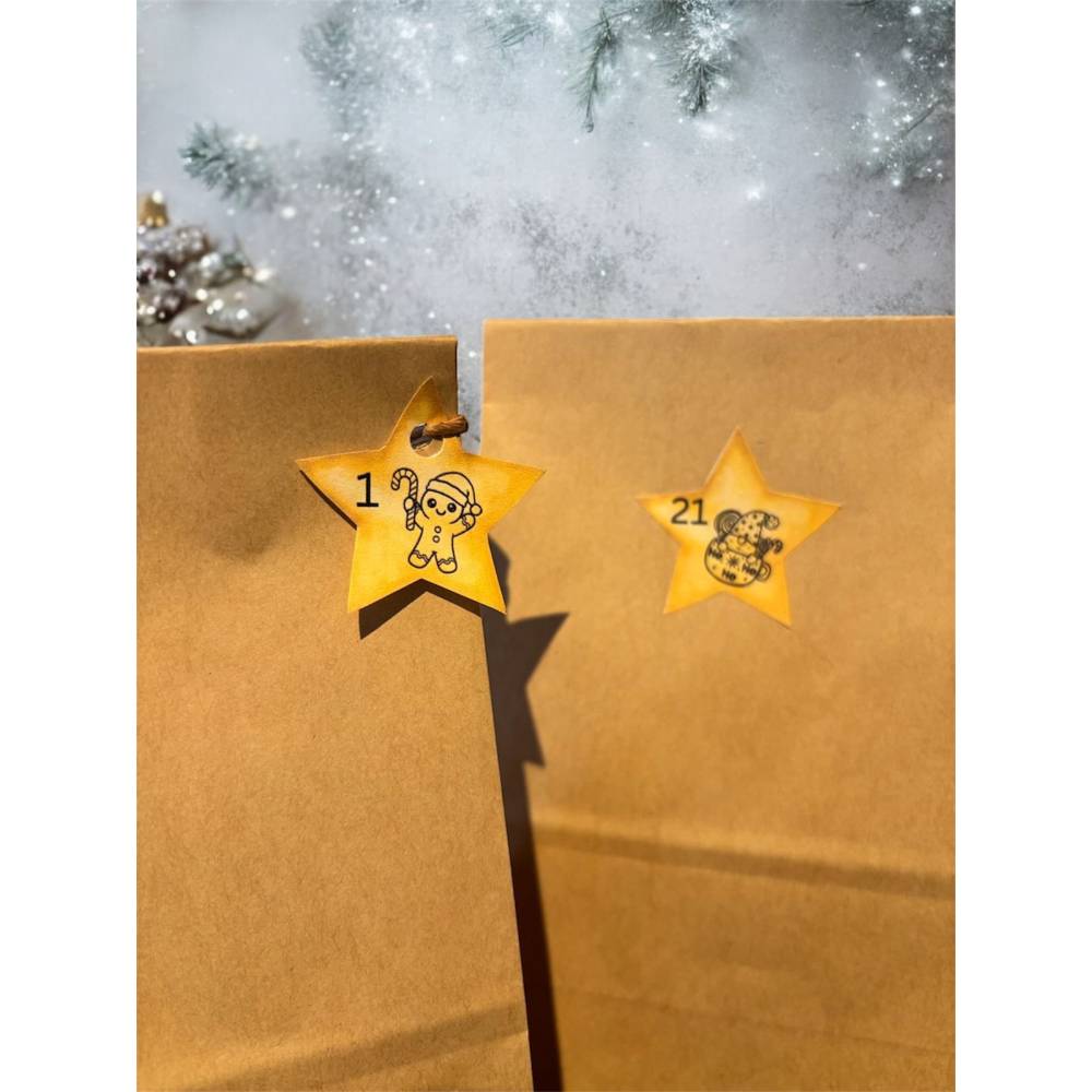 Mach deinen Adventskalender einzigartig! Mit liebevoll gestalteten Adventskalender-Zahlen in Sternenform verleihst du deinem DIY-Adventskalender, Geschenkbeuteln oder selbstgemachten Dekoideen eine festliche Note. Dieses hochwertige PDF-Set bietet dir 24 Sterne im warmen Goldton mit klar erkennbaren Zahlen von 1 bis 24.