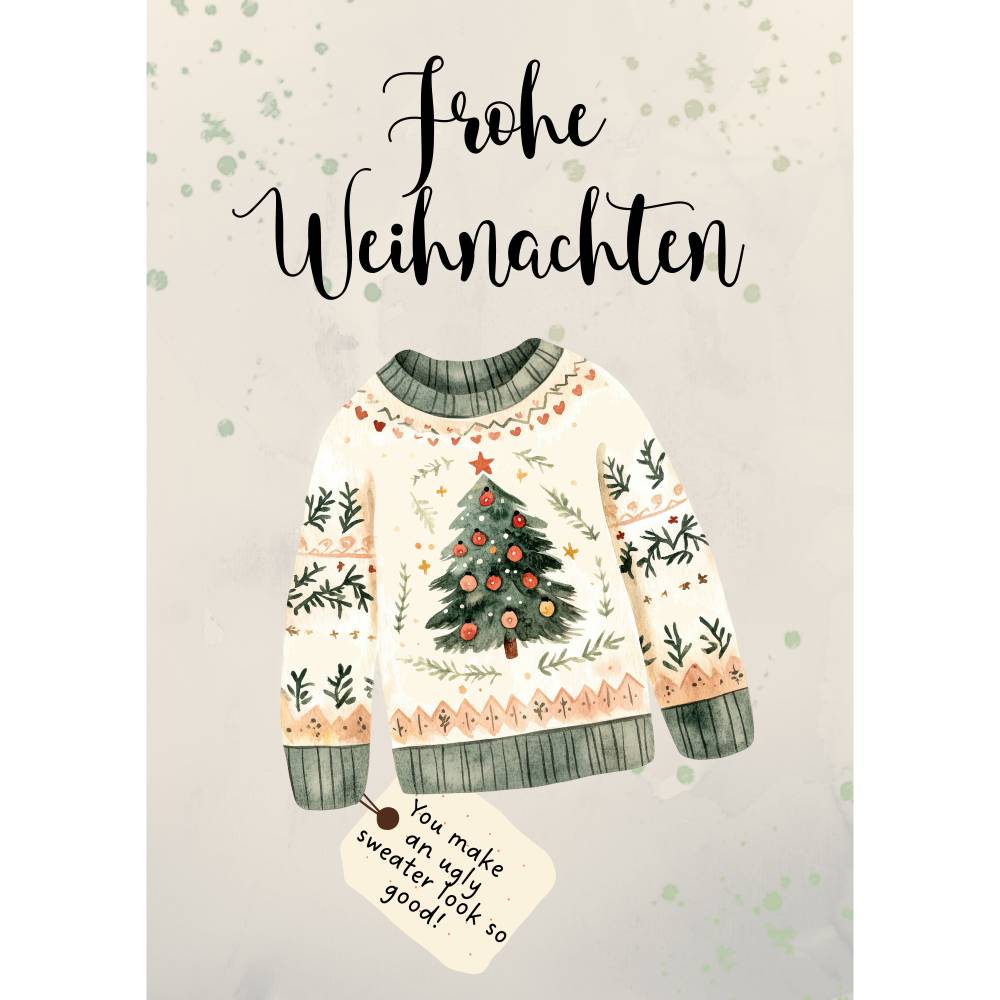 Verschenke Weihnachtsfreude: Die digitale Weihnachtskarte „Ugly Christmas Sweater“ bringt Humor und Wärme in die Adventszeit. Der süße Pullover mit Tannenbaum-Motiv und dem Schriftzug „Frohe Weihnachten“ sorgt für festliche Stimmung – ohne kitschig zu wirken.