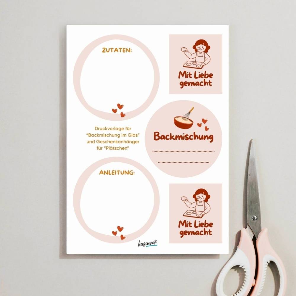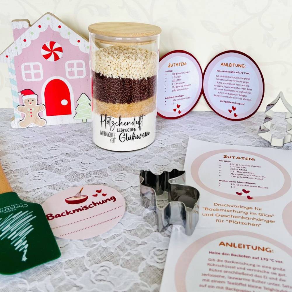 Mit diesem kostenlosen Printable erhältst du ein liebevoll gestaltetes Set zur Verzierungeiner Backmischung im Glas, perfekt für Weihnachten, Geburtstage, kleineMitbringsel oder einfach so.