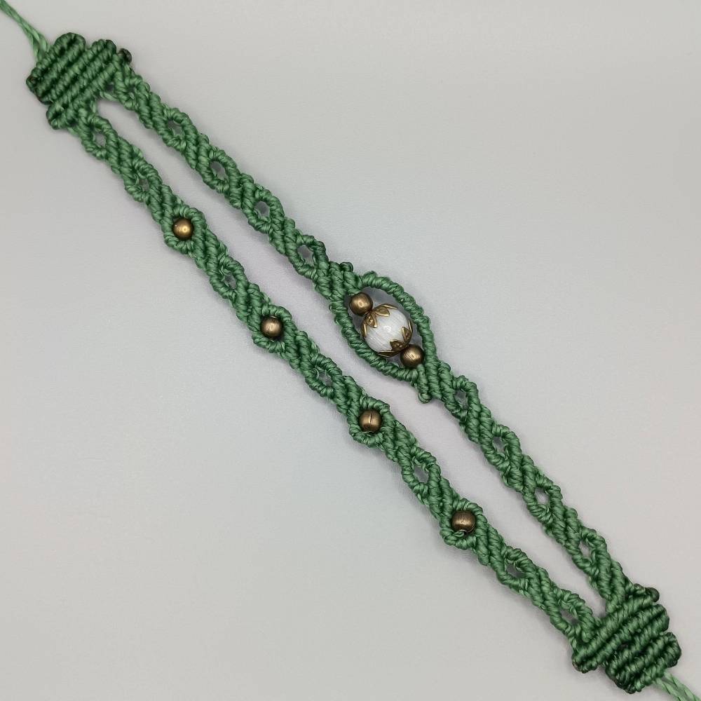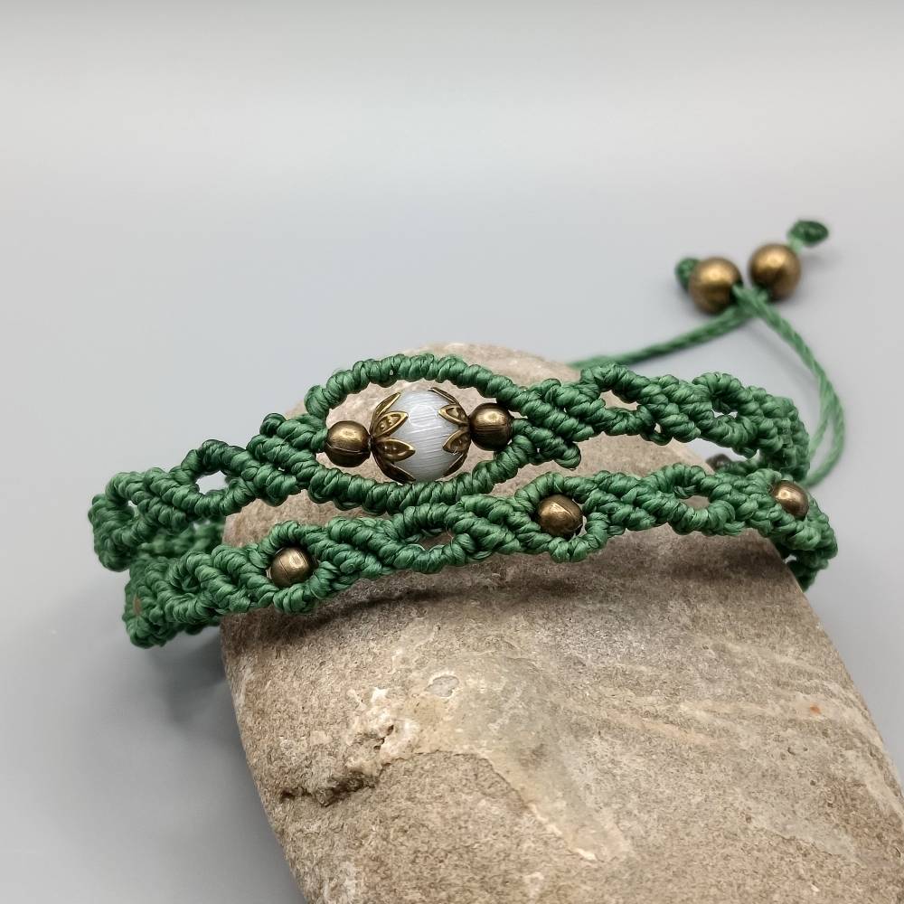 Makramee Armband 2in1 in grün mit einer weißen Glasperle und bronzefarbenen Metallperlen