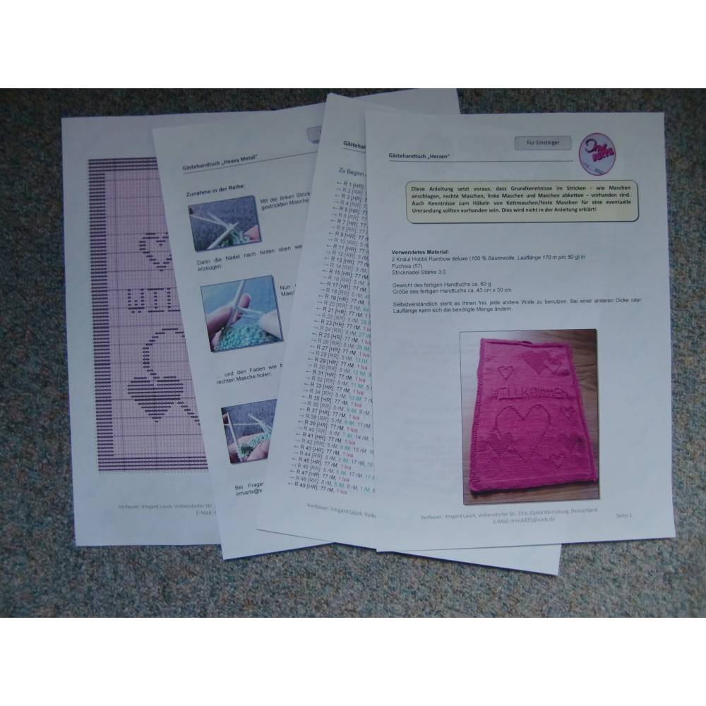 Wer mag kann das Gästehandtuch am Ende füreinen sauberen Rand mit festen Maschen umhäkeln, dann sollten diese Kenntnisseauch vorhanden sein. Die Anleitung selbst beinhaltet nur die Beschreibung fürdas Strickstück.