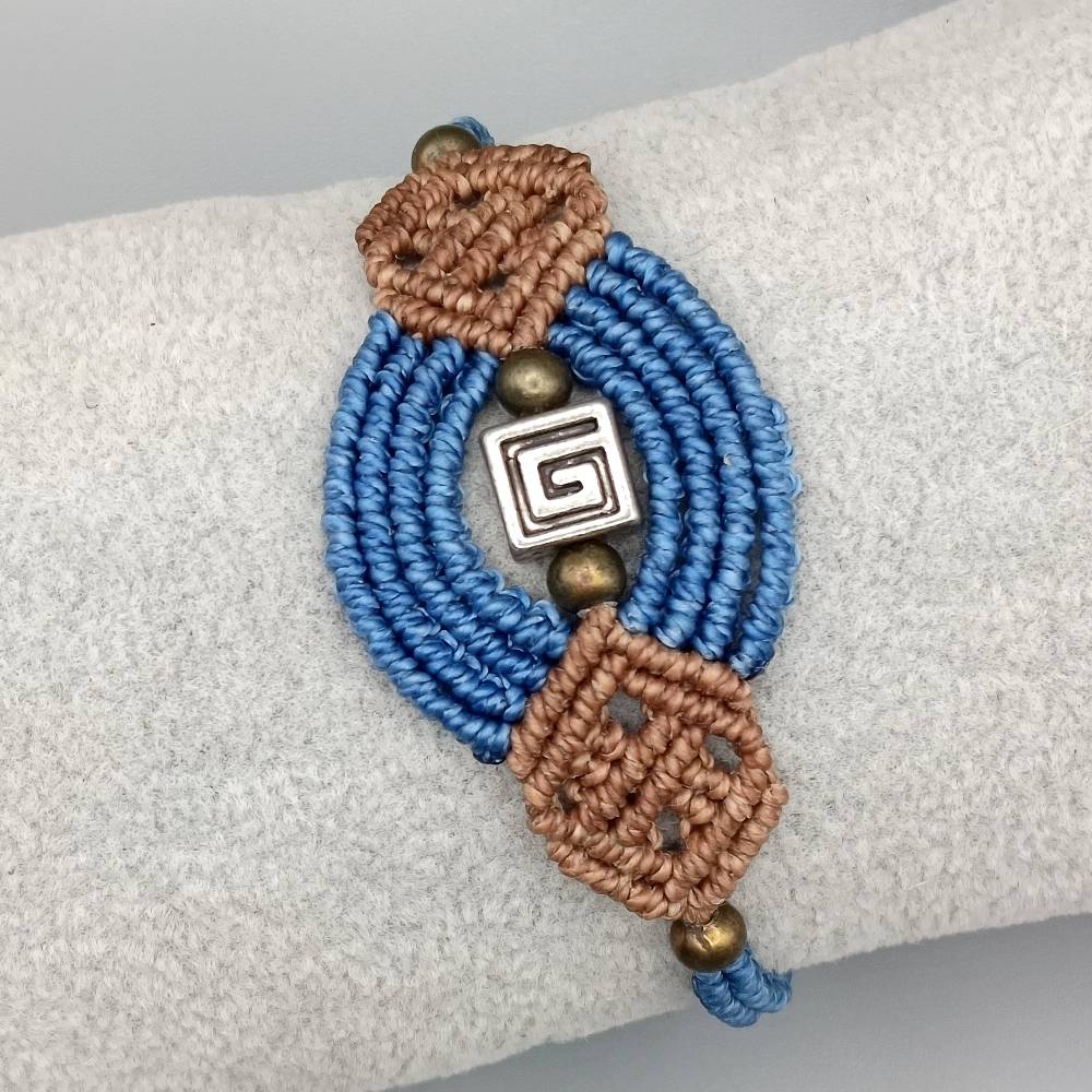 Makramee Armband in denimblau und braun mit einer silberfarbenen Metallperle und kleinen bronzefarbenen Perlen