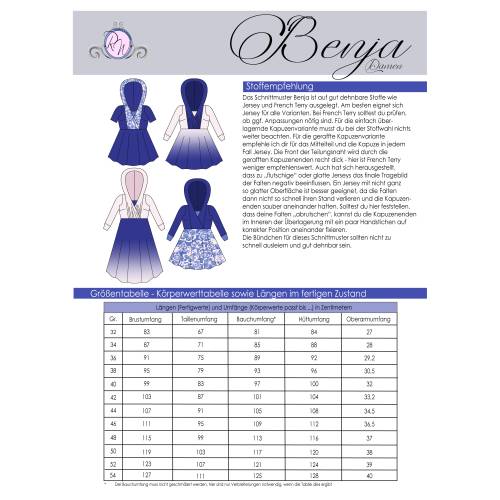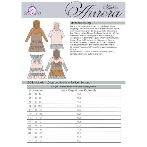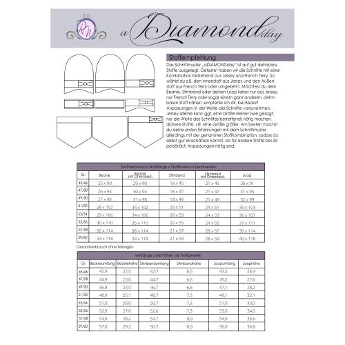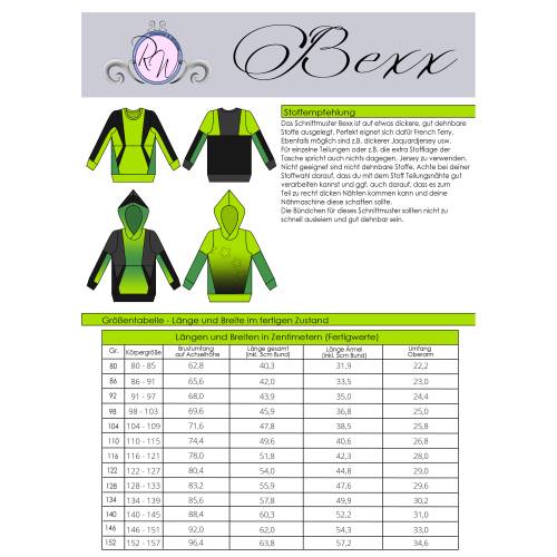 Das Schnittmuster ist in Echtgröße (du nähst hier nach echter Körpergröße) gradiert und enthält extra Ebenen mit Naht- (0,7cm) und Saumzugabe (2cm) . Diese können optional auch ausgeblendet werden. Es umfasst die Größen 74 bis 164 und ist damit für eine Körpergröße zwischen 74 und 169 cm geeignet. In den Dateien findest du die A4-Versionen zum Ausdrucken, eine A0-Datei (Großdruck) sowie die Beamerdatei - alle Versionen inkl. Ebenen zum Ein- und Ausblenden der Größen. Himbeerschnee ist auf dicke, gut dehnbare Stoffe ausgelegt.