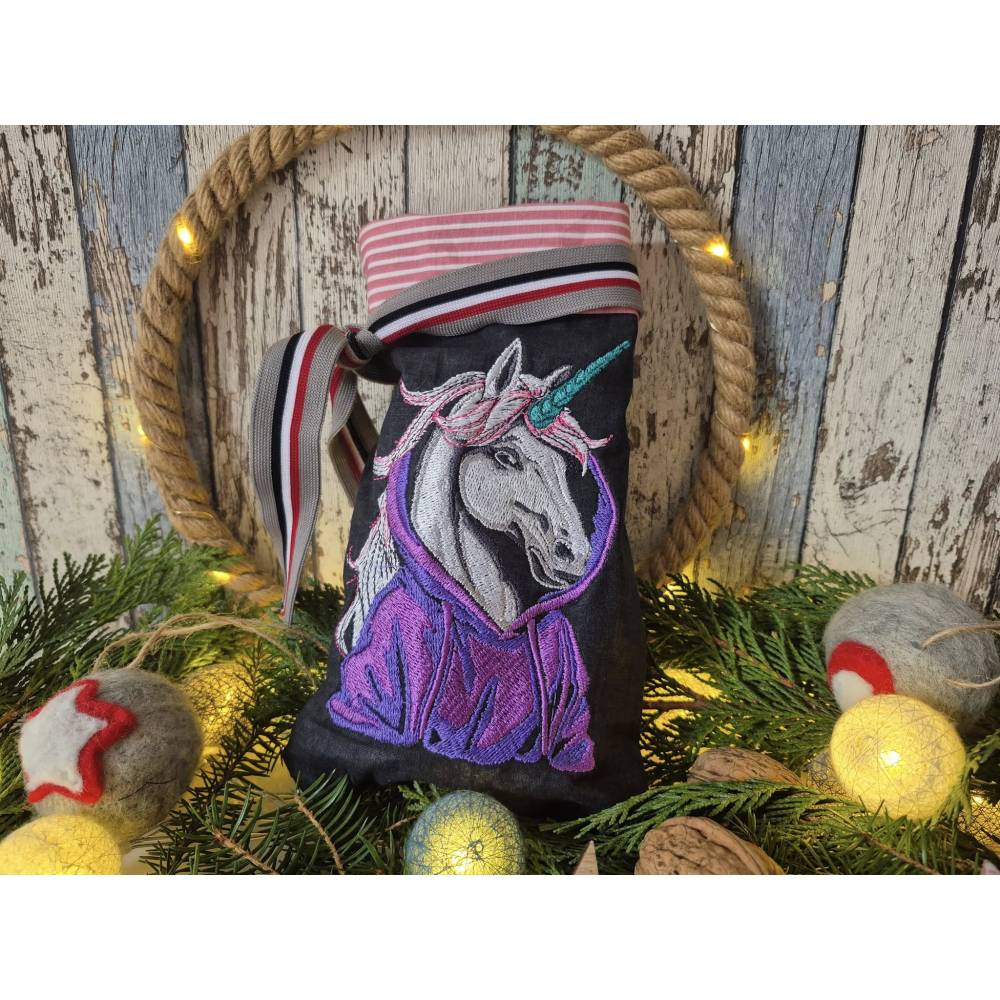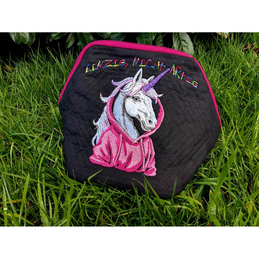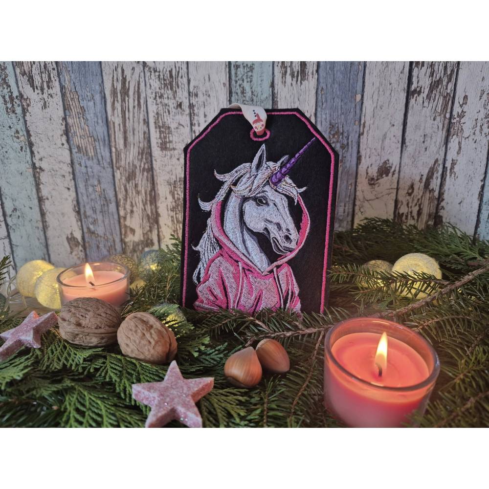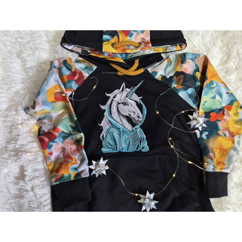 Magisches Einhorn im Hoodie – Stickdatei mit Color Lichteffekt für schwarze Stoffe