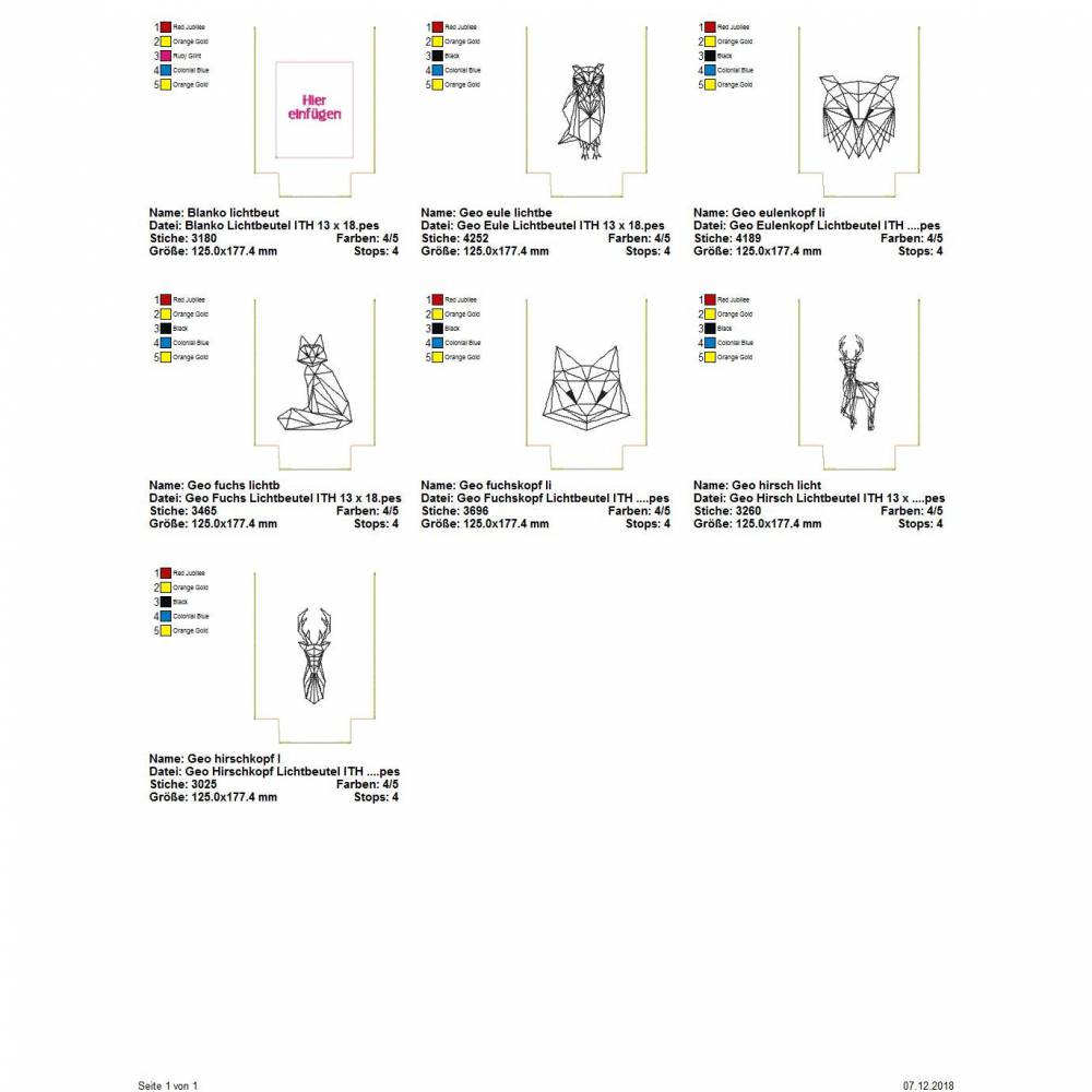 In dieser Serie sind insgesamt 7 digitale Stickdateien für den 13x18 cm (5x7") Stickrahmen enthalten. Eine davon ist eine Blanko Lichtbeutel, auf dem Ihr ein eigenes Motiv aufsticken könnt.