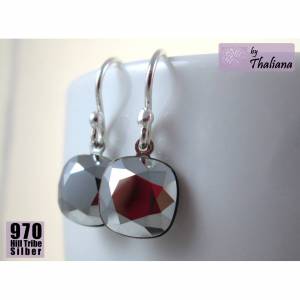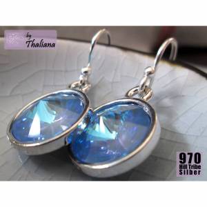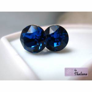 In der ausgesprochen hochwertigen (sehr gut verträglich, gefertigt in Deutschland!) Fassung thront jeweils ein 8mm Swarovski Element in einer außergewöhnlichen Sonderfarbe: ein mattes, dunkles Blau, für mich ein dunkles Jeansblau. Durch den matten Effekt sind die Kristalle farbintensiver als transparente "Kollegen", was eine sehr schöne Wirkung ergibt. Insbesondere gefällt mir hier, wie die Kristalle bei Lichteinfall hell "leuchten".