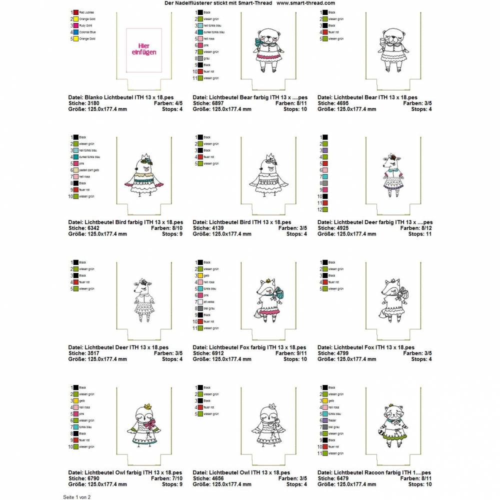 In dieser Serie sind insgesamt 13 digitale Stickdateien für den 13x18 cm (5x7") Stickrahmen enthalten. Eine davon ist eine Blanko Lichtbeutel, auf dem Ihr ein eigenes Motiv aufsticken könnt.