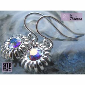 Für diese wunderhübschen Ohrstecker habe ich in Deutschland gefertigte Fassungen mit jeweils einem Swarovski Element in 6mm-Größe (mit Rand ergibt sich ein Gesamtdurchmesser von ca. 8mm) bestückt. Die Fassungen sind bestens verträglich und hochwertig versilbert - eine tolle Qualität und ein gutes Gefühl, einen hierzulande tätigen Betrieb zu unterstützen anstatt in billige Fernost-Ware zu investieren ;)