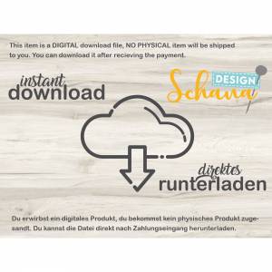 Du erwirbst eine digitale Datei, kein fertiges Endprodukt. Zur Nutzung der Dateien benötigst du die entsprechende Software und Endgerät (z. b. Schneideplotter, Drucker, o.ä.).
