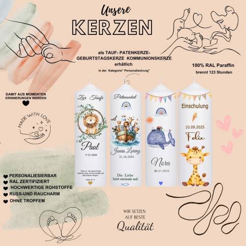 ZU DIESER GASTKERZE BIETEN WIR AUCH DIE PASSENDE GROSSE TAUFKERZE IN EINEM SEPERATEN ANGEBOT IN UNSEREM SHOP AN.