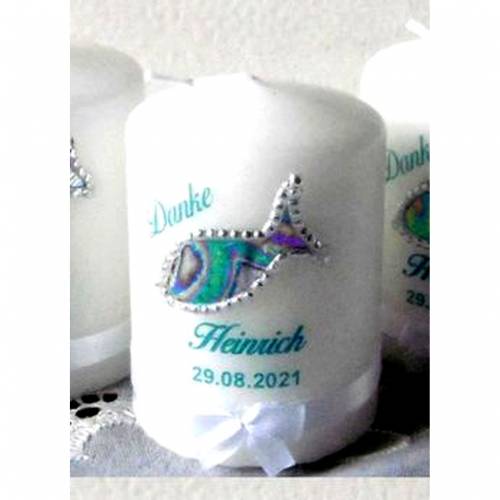 Hier bieten wir Ihnen kleine trendige Gastgeschenke-Kerzchen, die mit dem christlichen Fischsymbol auf einem hellblauen Wachsquadrat und farblich angepaßtem Foliendruck mit Ihrem Wunschtext gestaltet werden.