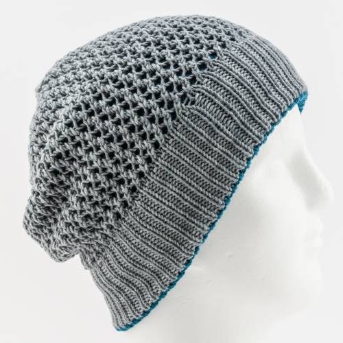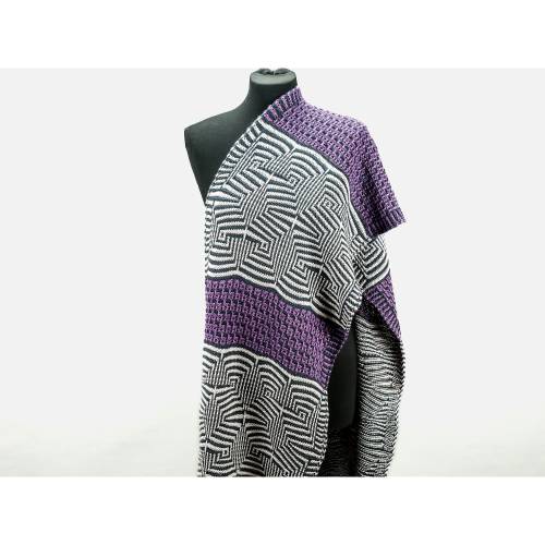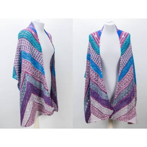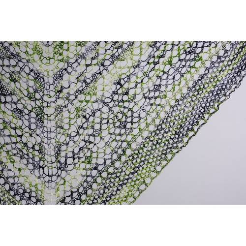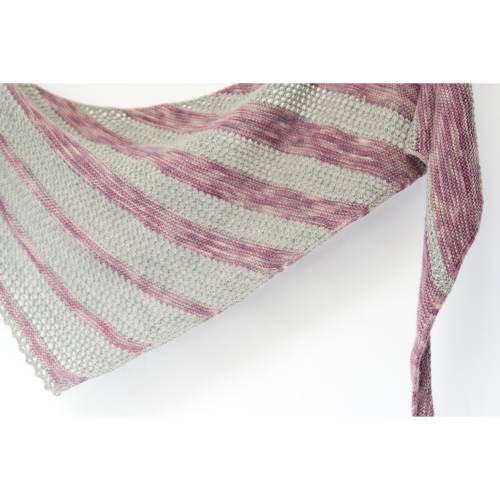 Dieses langgezogene, asymmetrische Dreieckstuch ist eine wunderbare Gelegenheit, um mehrere Stränge Garn, die einen Farbverlauf bilden, zur Geltung zu bringen. Die farbigen Punkte passen sich effektvoll in die durchgängige Rippenstruktur des Tuchs ein.