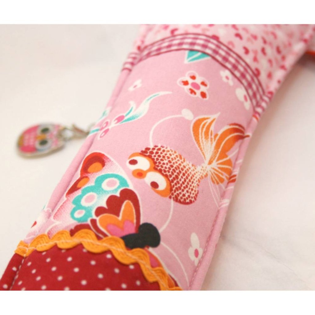 Auf der gepatchten Vorderseite kannst du wunderbar Farbtöne kombinieren; ein "Accord" aus drei Farben schafft Harmonie und ist kindgerecht bunt. Der Stoffmix aus Mustern, Farben und Stoffarten erlaubt es Dir, Dein eigenes Design zu verwirklichen. Ergänzend dazu kannst Du die Flötentasche mit Webbändern, Zackenlitze, Paspelband, Nieten, Stickereien und was Dir noch Schönes einfällt, verzieren und so eine individuelle Aufbewahrung für die Flöte kleiner Musiker zaubern.