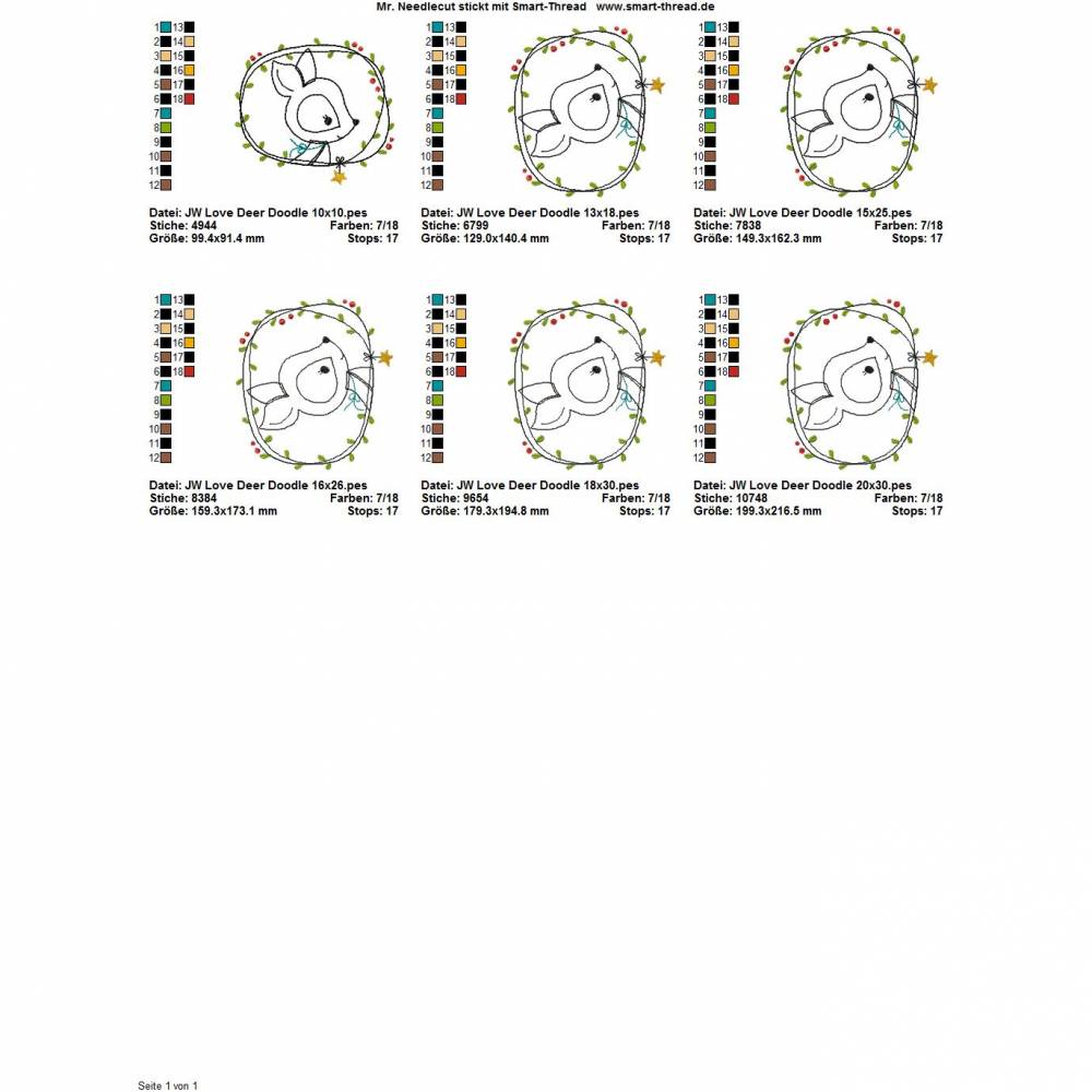 Die genauen Größen und die Stichanzahl der einzelnen Dateien findet Ihr in der Farbansicht bei den Vorschaubildern.